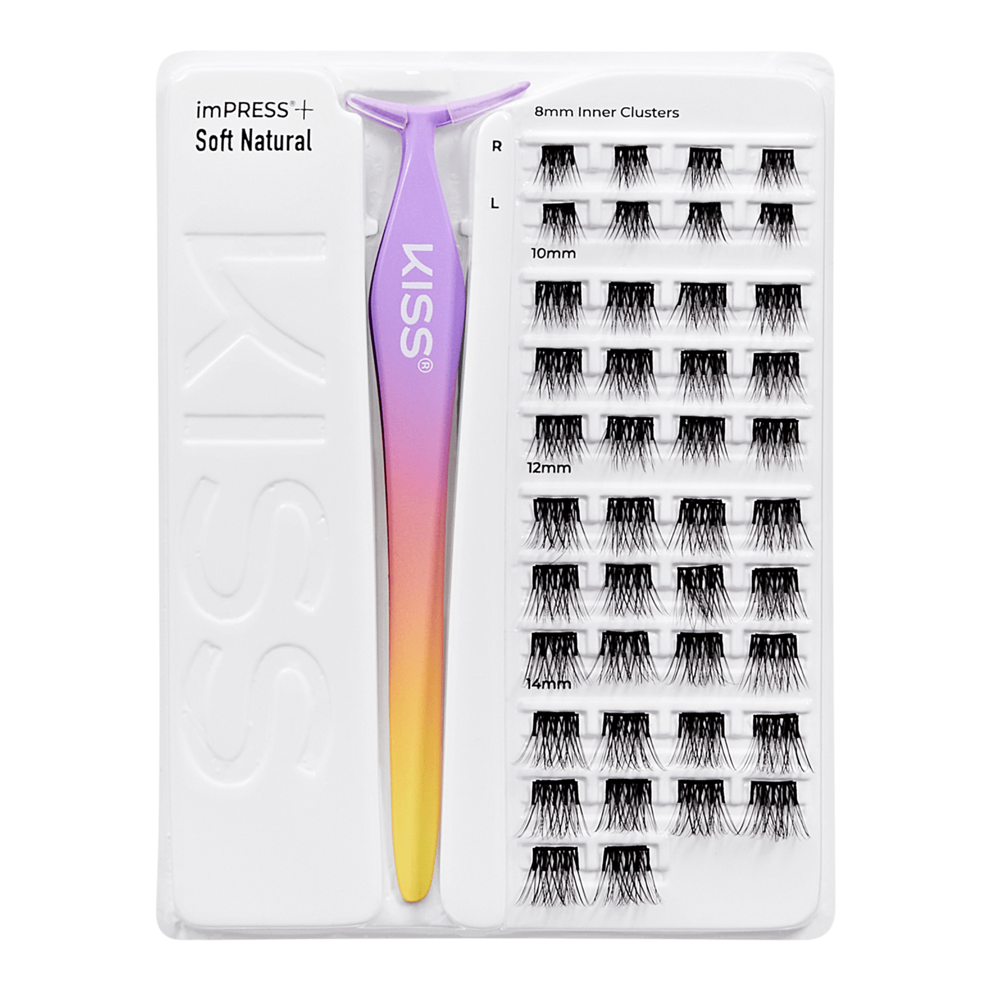 Lash in a flash with NO GLUE NEEDED! Kiss imPRESS+ Press On Self Adhesive Eyelashes, with pre-bonded breakthrough technology, now come with inner clusters for precise placement on your inner eye. Press on under-lash application lets you lash in 1 simple step.