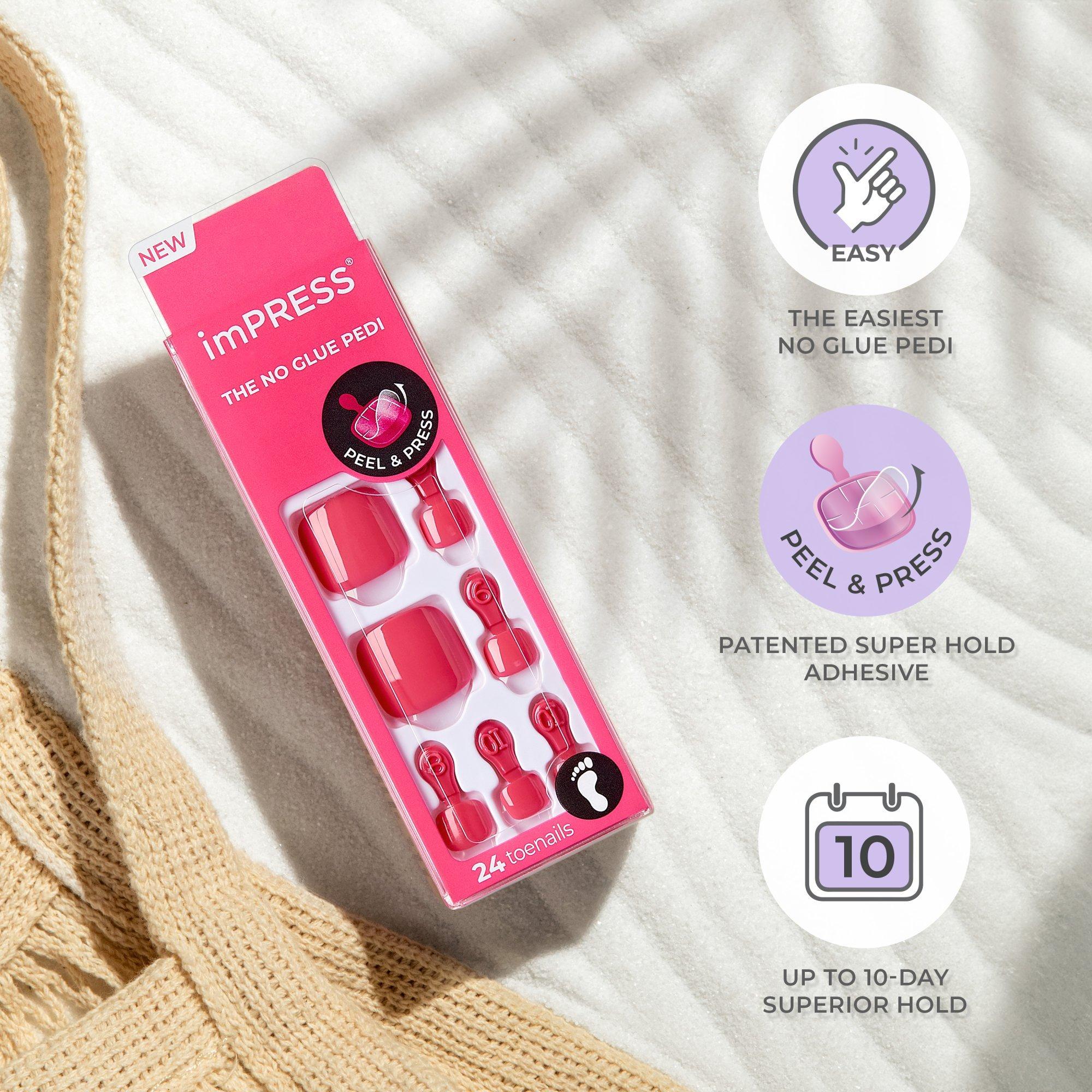 For Your Toes Only! Exclusive on-trend solid color press-on pedicures. Get a perfect at-home pedi in minutes with Kiss's imPRESS Roundabout Press-On Pedicure Toenails. These false toenails come ready to wear, no glue or polish needed.