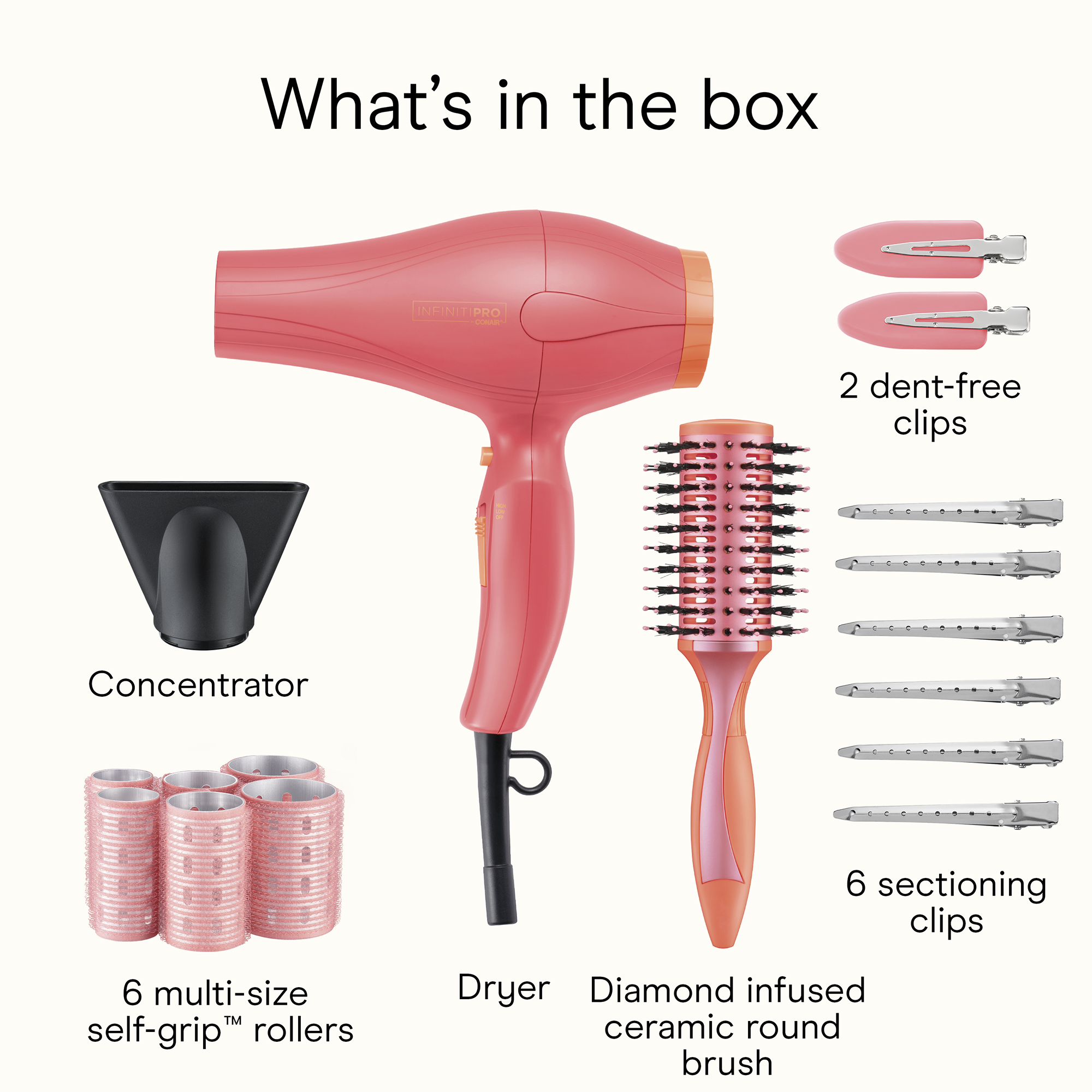 Skip the salon and create a flawless blowout with the InfinitiPRO By Conair 17-Piece Blowout Kit. Includes pro dryer, diamond-infused round brush, thermal rollers, and styling tools. Boost volume, shape, and style with everything you need.