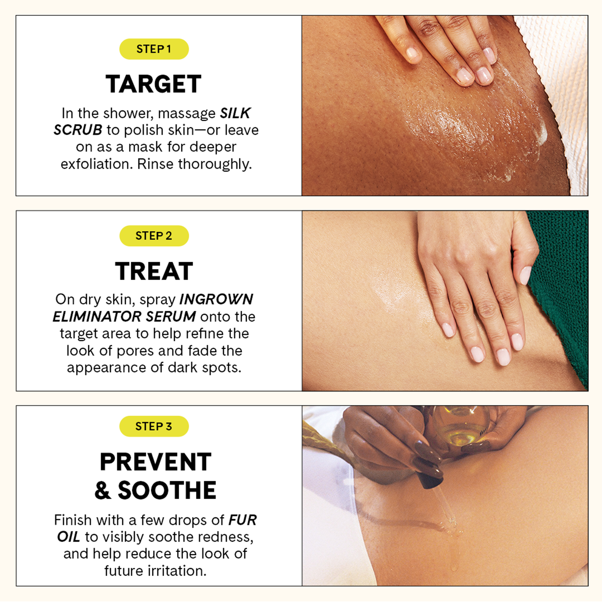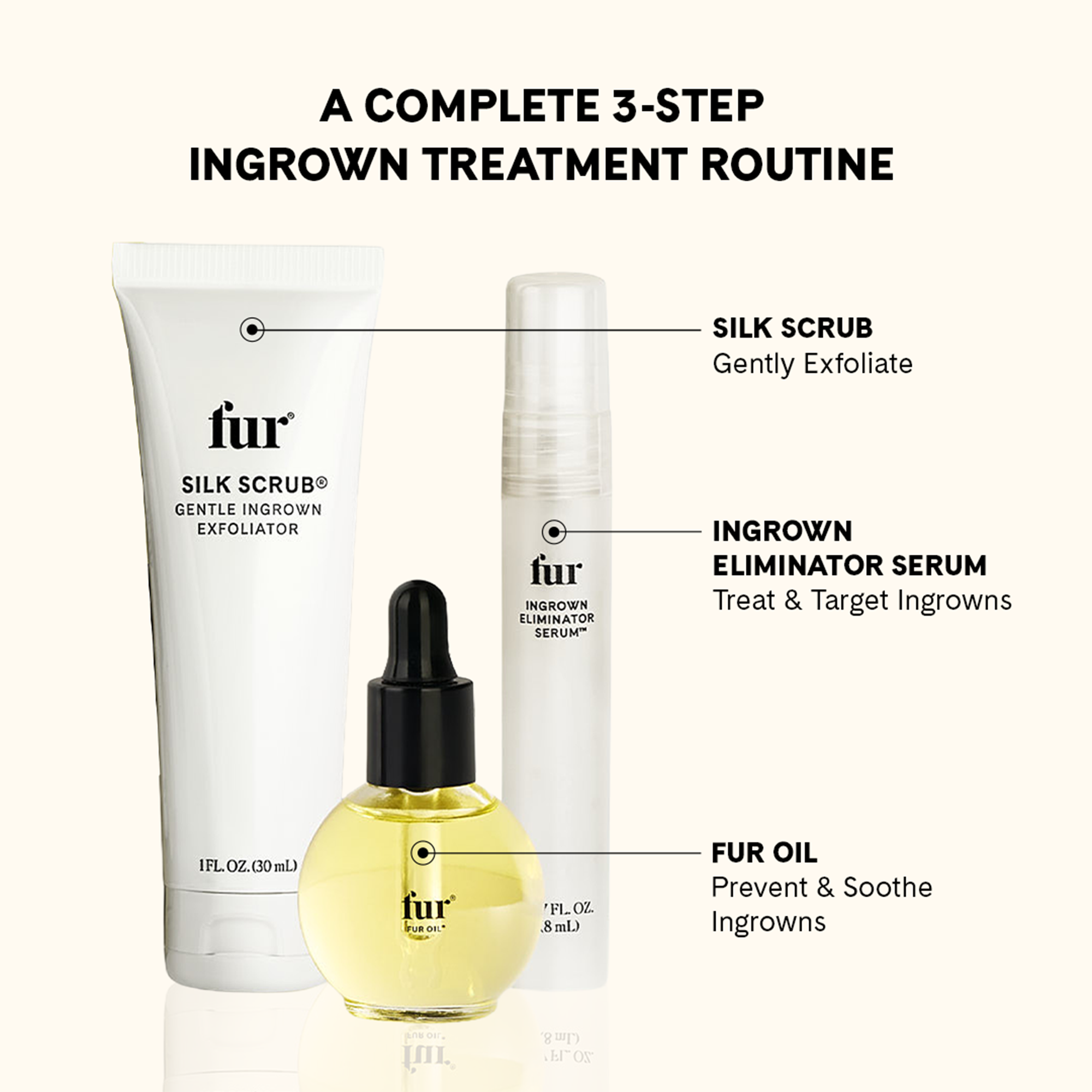 Ingrown Rescue Trio brings together Fur’s most effective ingrown-fighting essentials in one exclusive, easy-to-follow kit. This complete three-step routine delivers everything skin needs to target, treat, and help prevent ingrowns—making consistent care simple to start and easy to maintain.