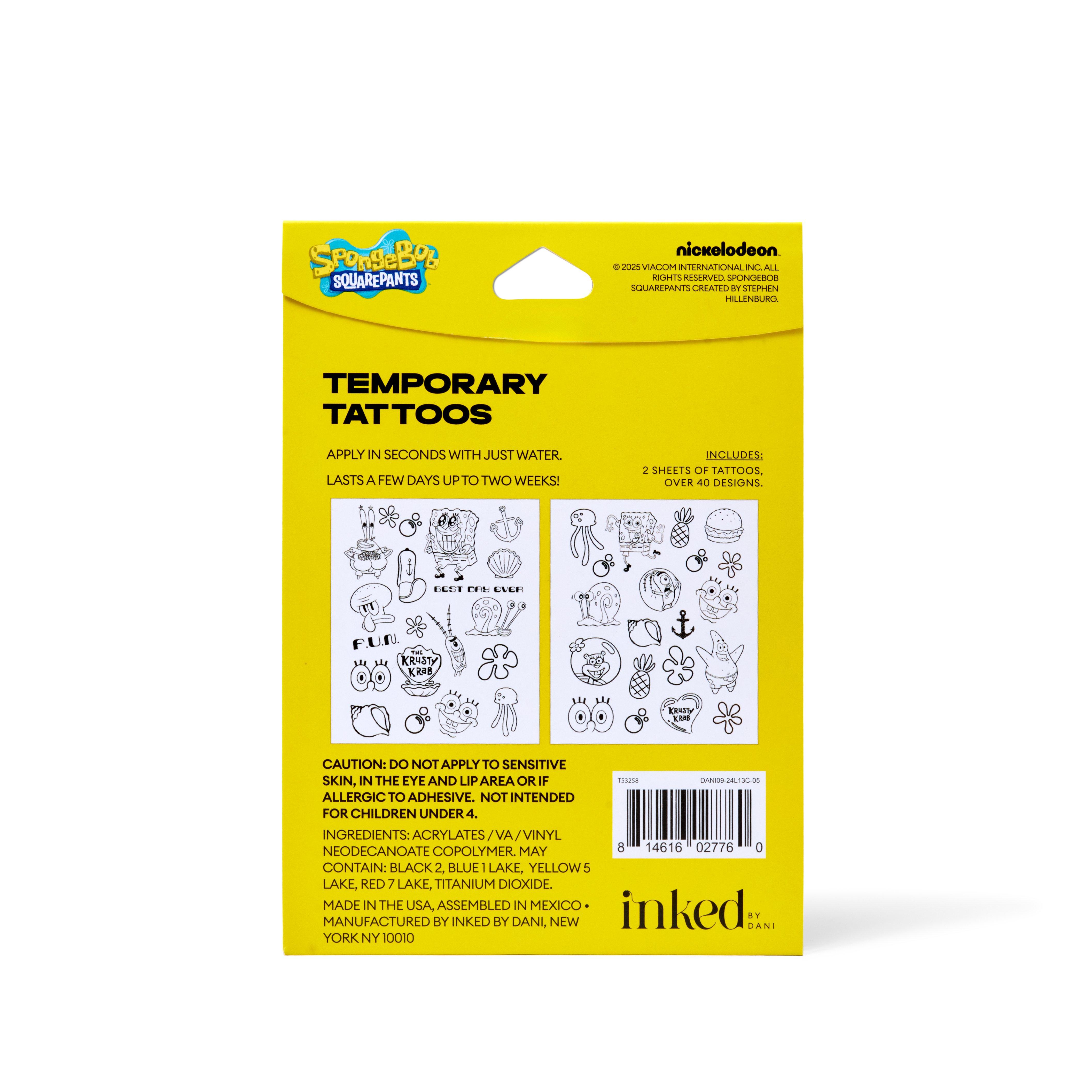 Straight from Bikini Bottom and ready to party, our new SpongeBob SquarePants tattoos bring pure nostalgia to your skin. ©2025 Viacom International Inc. All Rights Reserved. SpongeBob SquarePants created by Stephen Hillenburg.