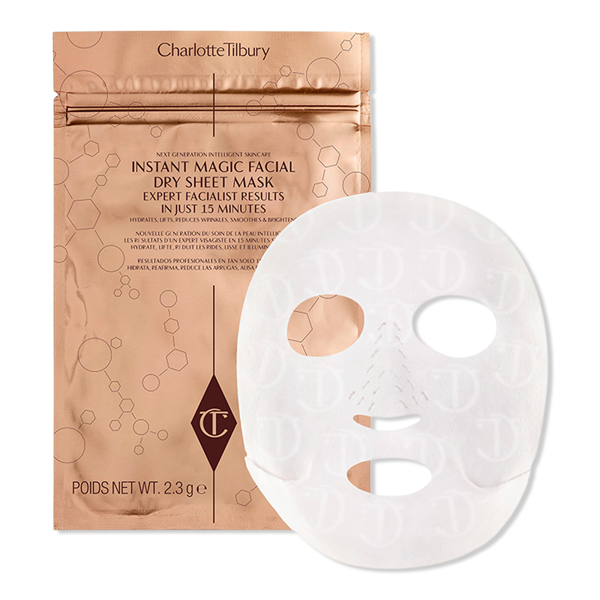 Charlotte Tilbury's Instant Magic Facial Dry Sheet Mask is a reusable, dry sheet mask with a revolutionary biomimetic delivery system that hydrates, lifts, and brightens the look of skin.