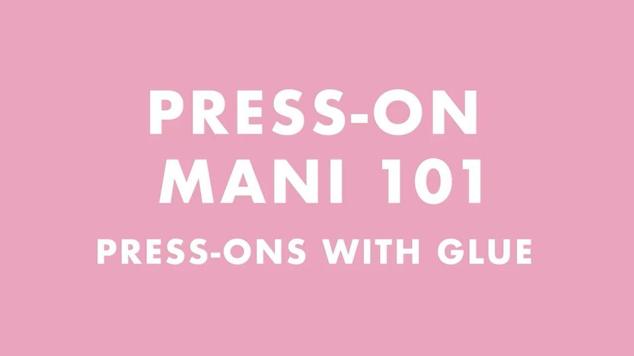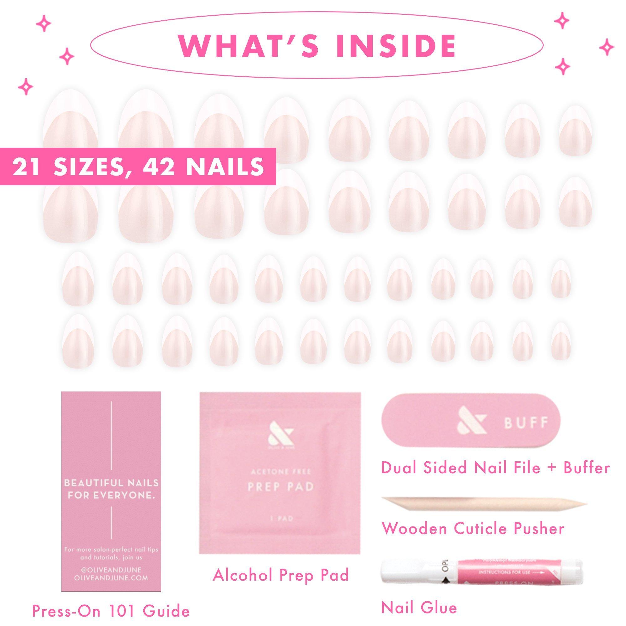 Find your best fit. Push back cuticles and gently buff nails. Wipe with prep paid. Apply glue to the press-on nail and the natural nail. Slide the press-on nail onto the natural nail and hold for 30 seconds. Repeat with remaining nails.
