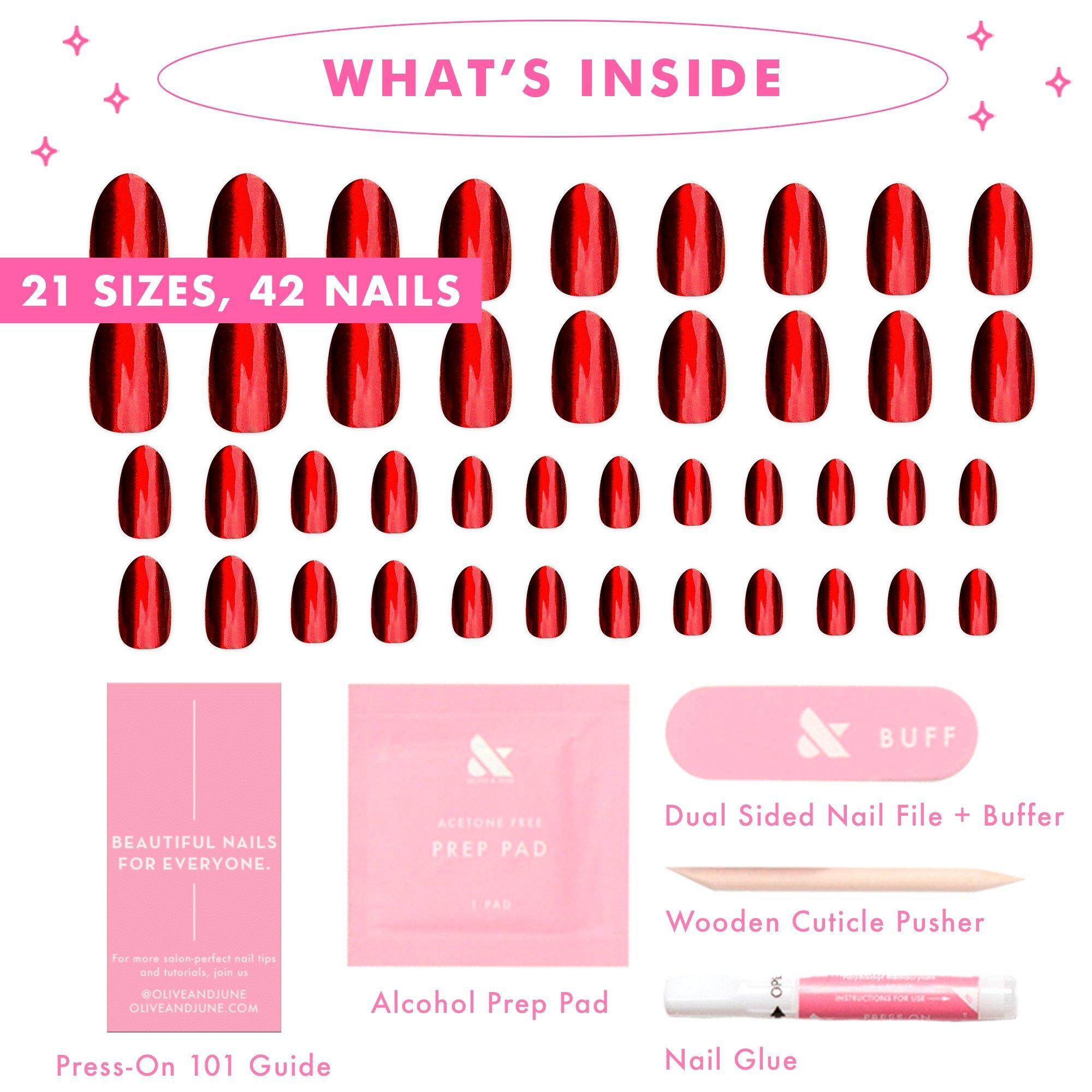 • 42 nails, 1 nail file, 1 cuticle pusher, 1 prep pad, 1 glue