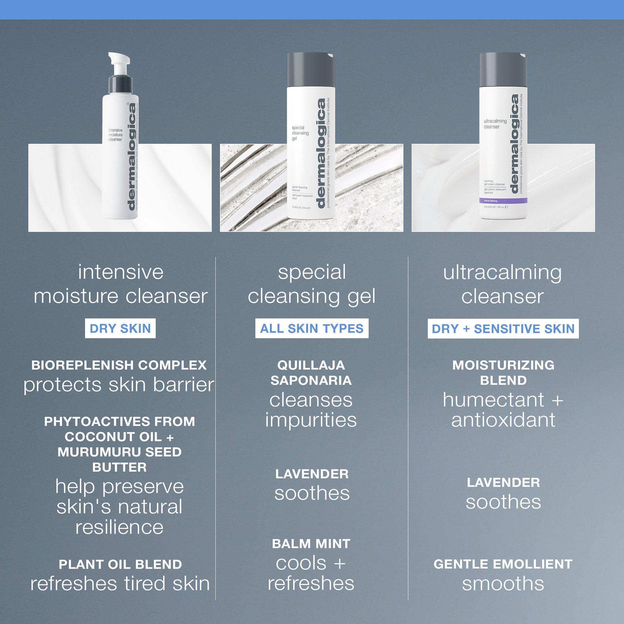 Dermalogica's Intensive Moisture Cleanser is a light and hydrating cream cleanser for dry skin. It leaves the skin feeling clean, smoother, softer and more luminous. Also, removes impurities, while actively moisturizing dry, depleted skin.