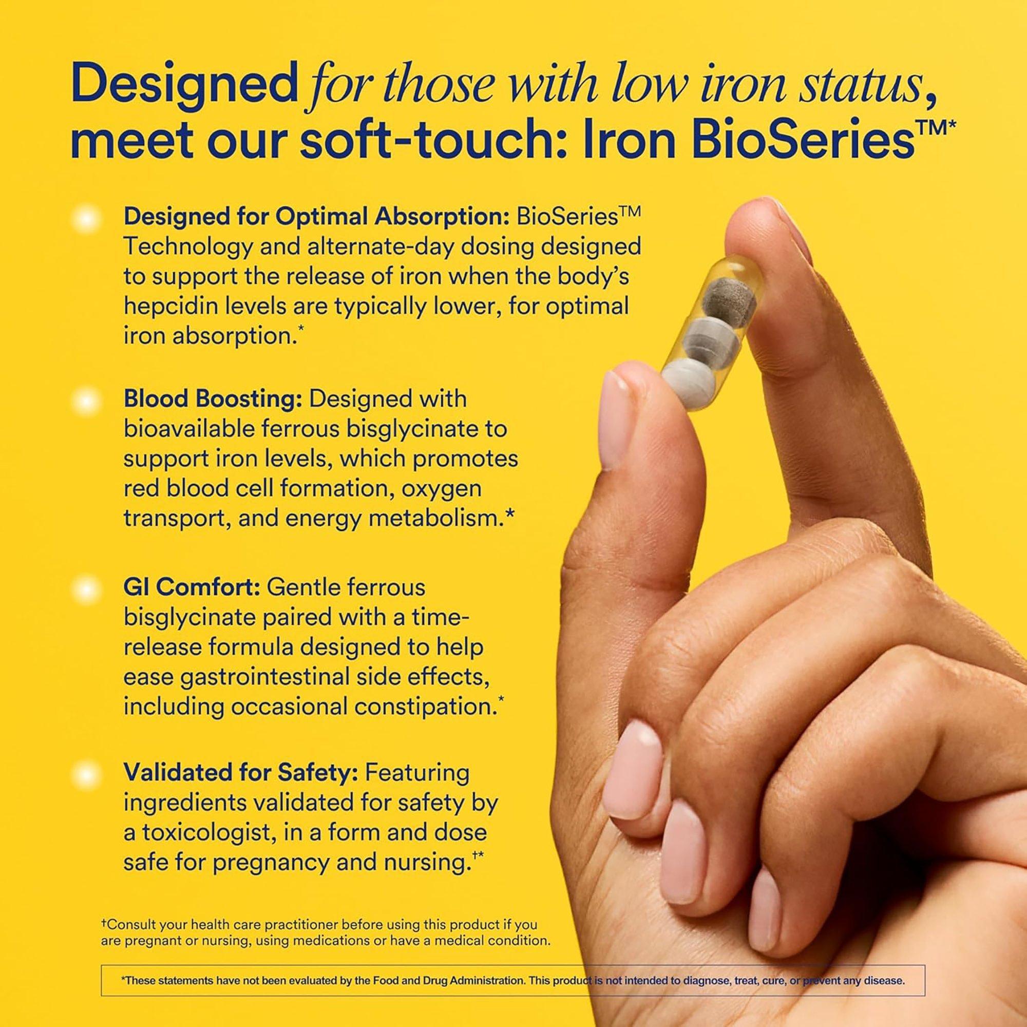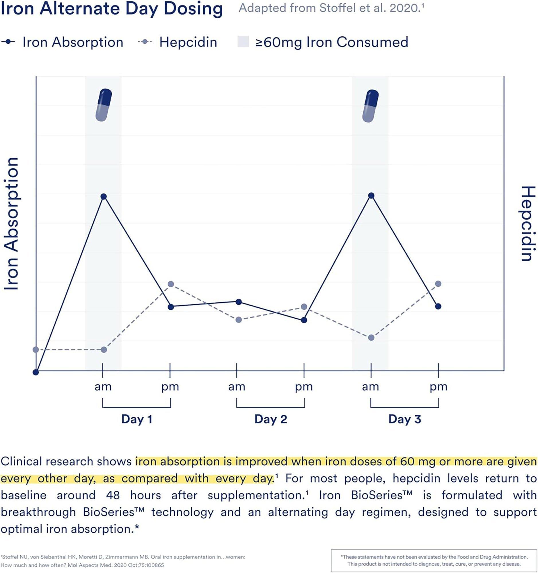 • DESIGNED FOR OPTIMAL ABSORPTION: BioSeries Technology combined with alternate-day dosing, designed to support the release of iron when the body’s hepcidin levels are typically lower, for optimal iron absorption.*