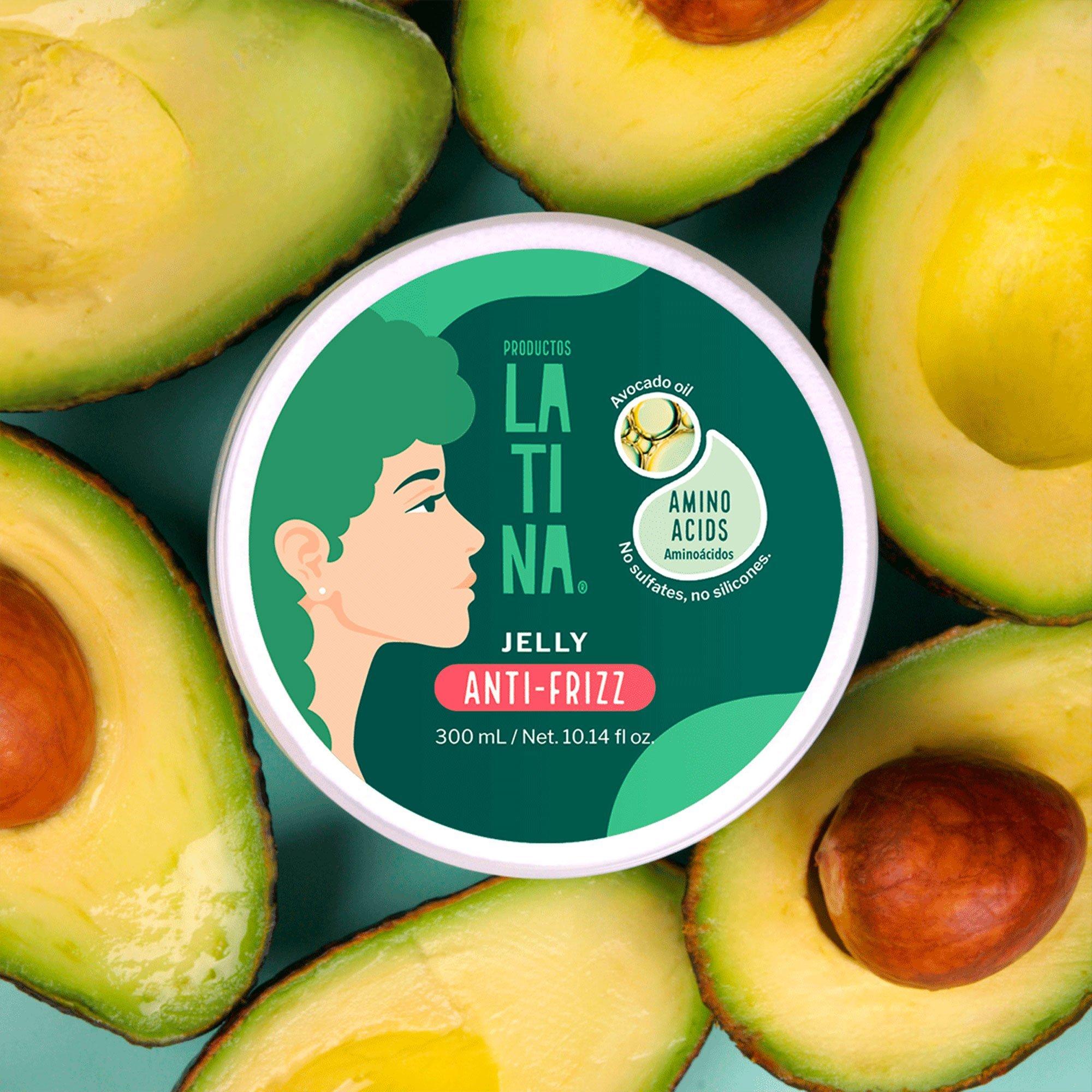 Productos LATINA Anti-frizz Jelly. Creates a medium-hold layer that will help control frizz for longer. Residue free. With amino-acids and avocado oil.