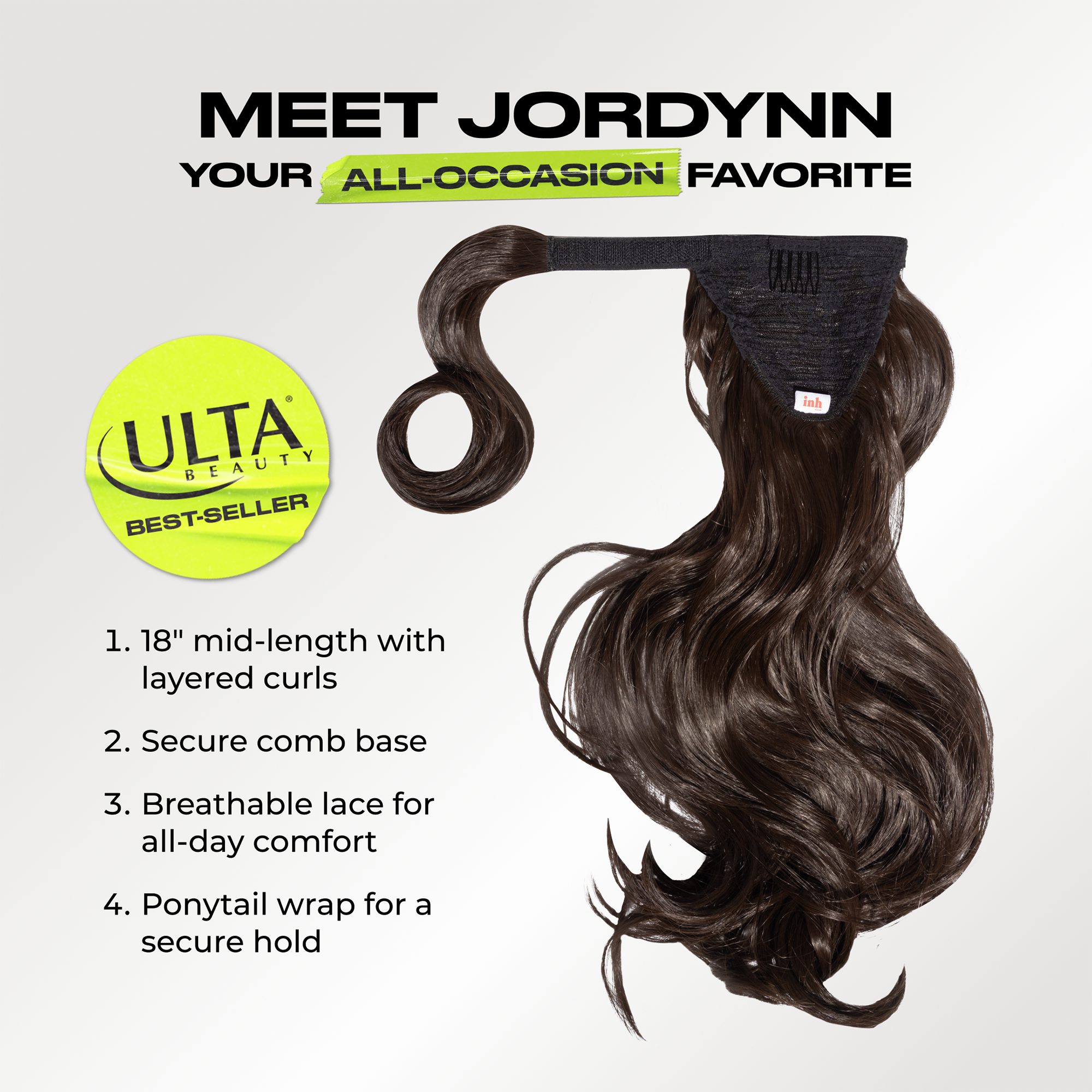 Meet Jordynn, one of INH Hair's best selling styles. This ponytail hair extension is perfect for instantly longer, voluminous hair. Achieve a professional looking updo in seconds without damage, this 18 inch mid length ponytail extension is loved by beginners who want effortless style anytime.