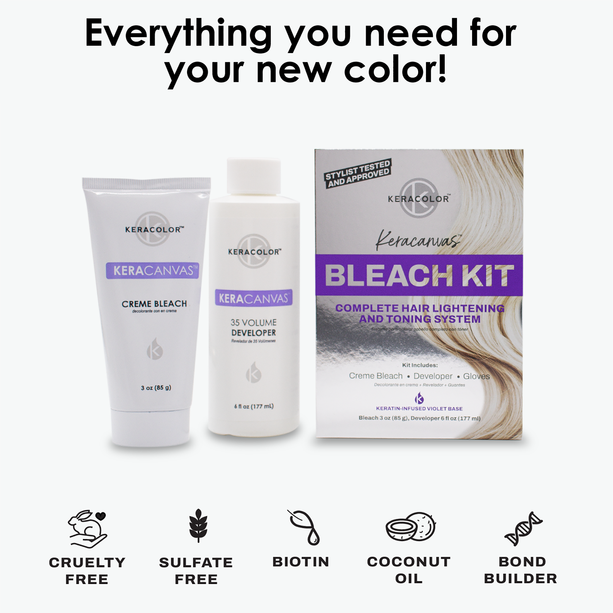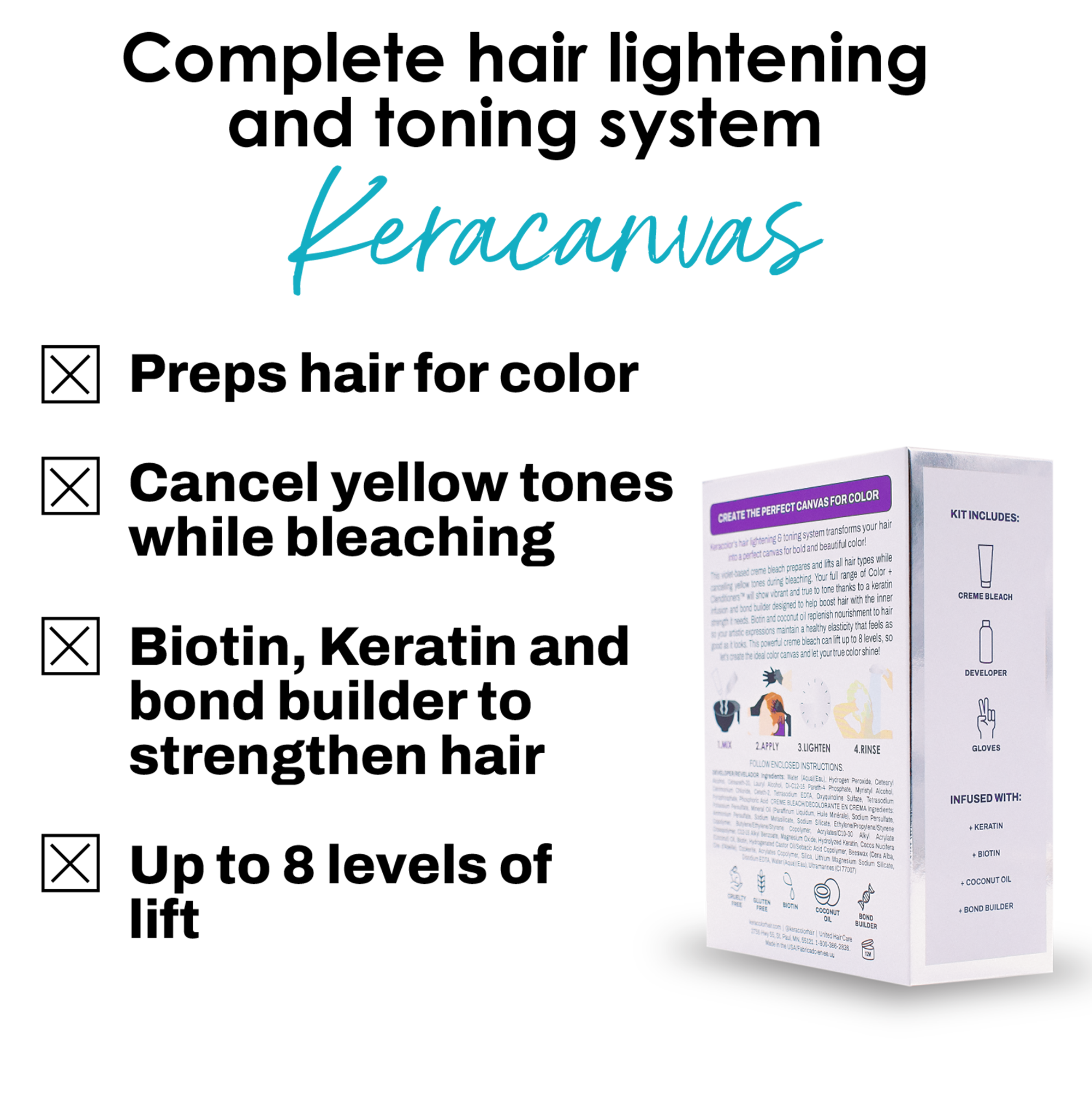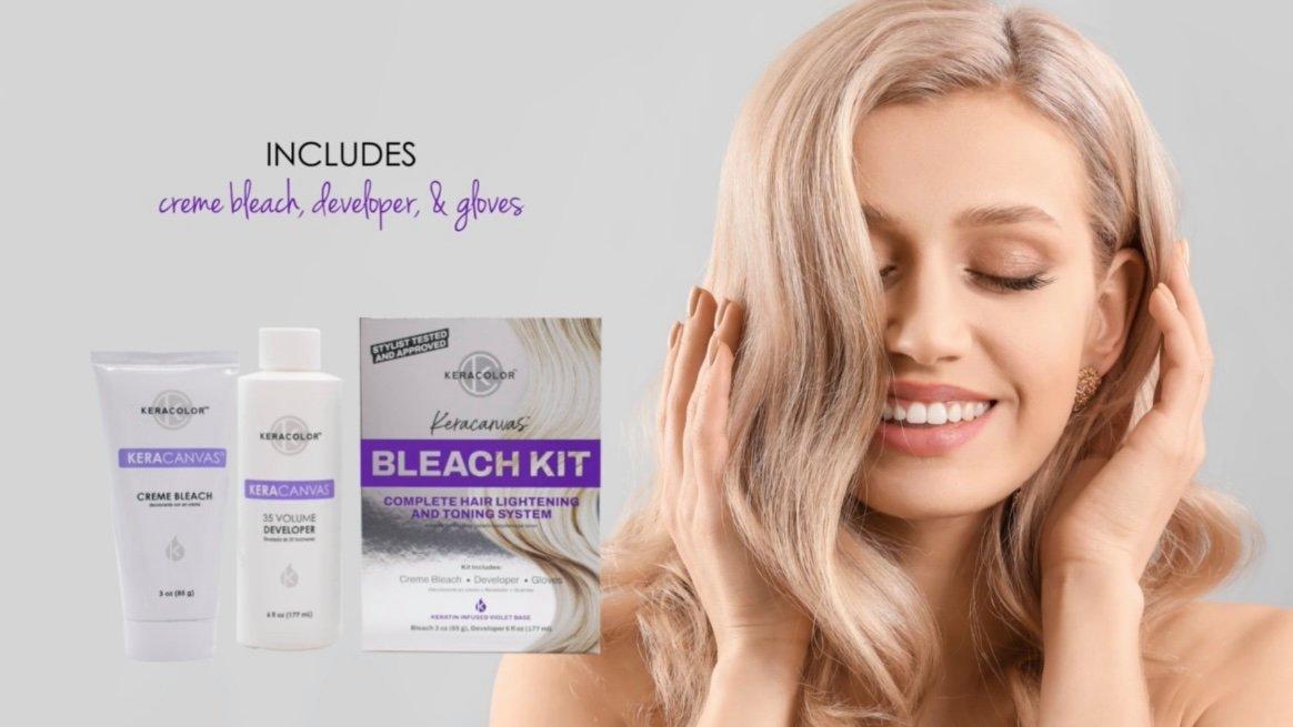 Keracolor's Keracanvas Complete Hair Lightening & Toning System transforms your hair into a perfect canvas for bold and beautiful color. This violet-based creme bleach prepares and lifts all hair types while cancelling yellow tones during bleaching. Can lift up to 8 levels.