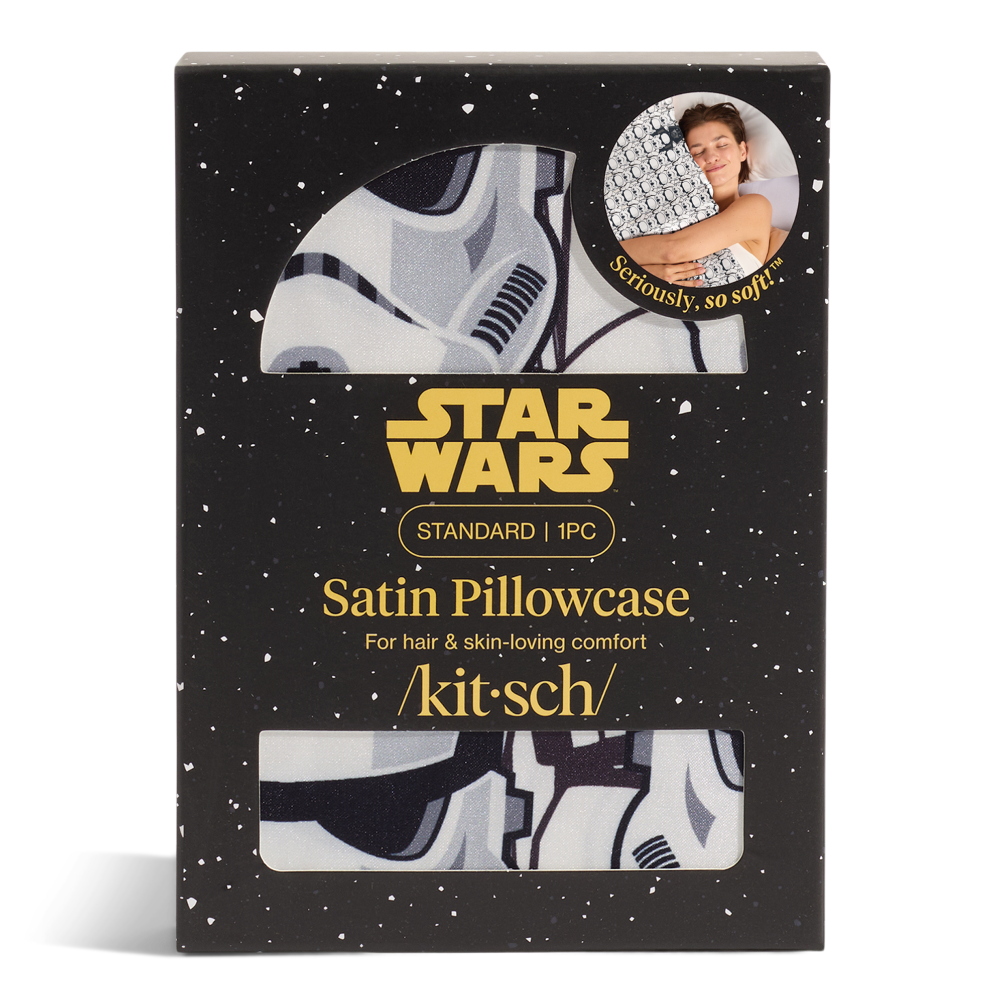 Rule the night with this Kitsch x Star Wars Standard Satin Pillowcase. Crafted from smooth satin to help protect hair and skin, it lets you drift to the dark side in comfort—because even Sith Lords deserve flawless beauty sleep.