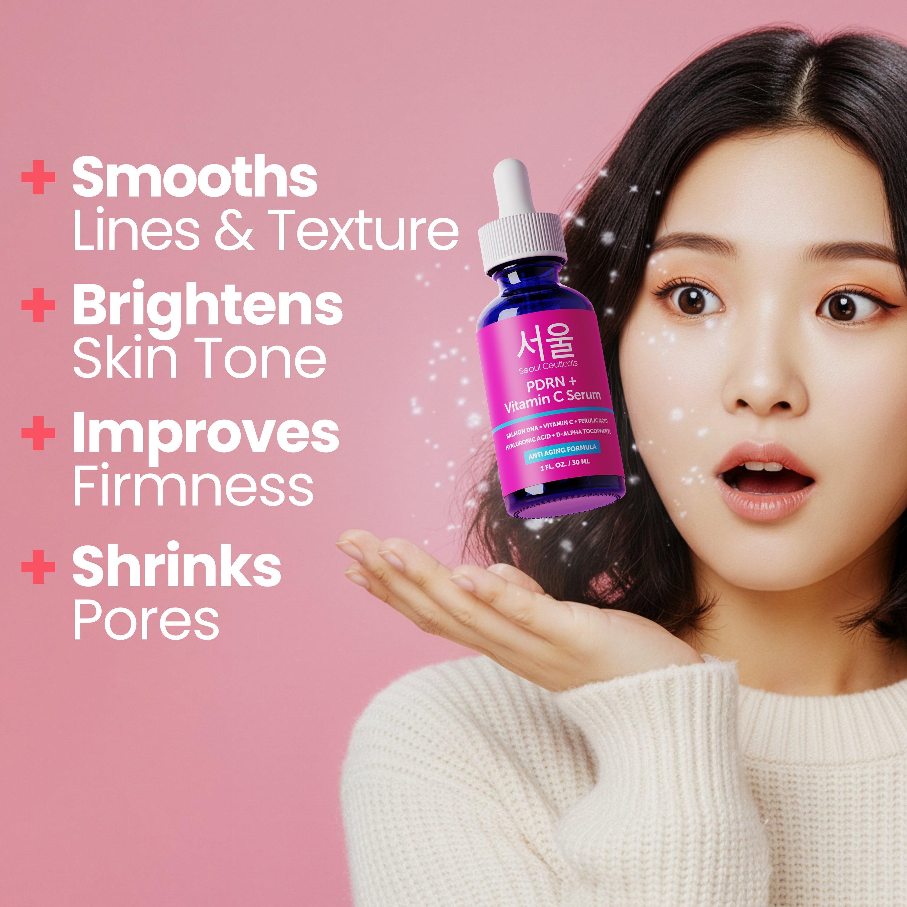 PDRN Serum, Salmon DNA and Vitamin C work together to enhance radiance, support firmness, and smooth dull skin. This Korean anti aging face serum helps improve uneven tone and texture for a more refined, youthful appearance