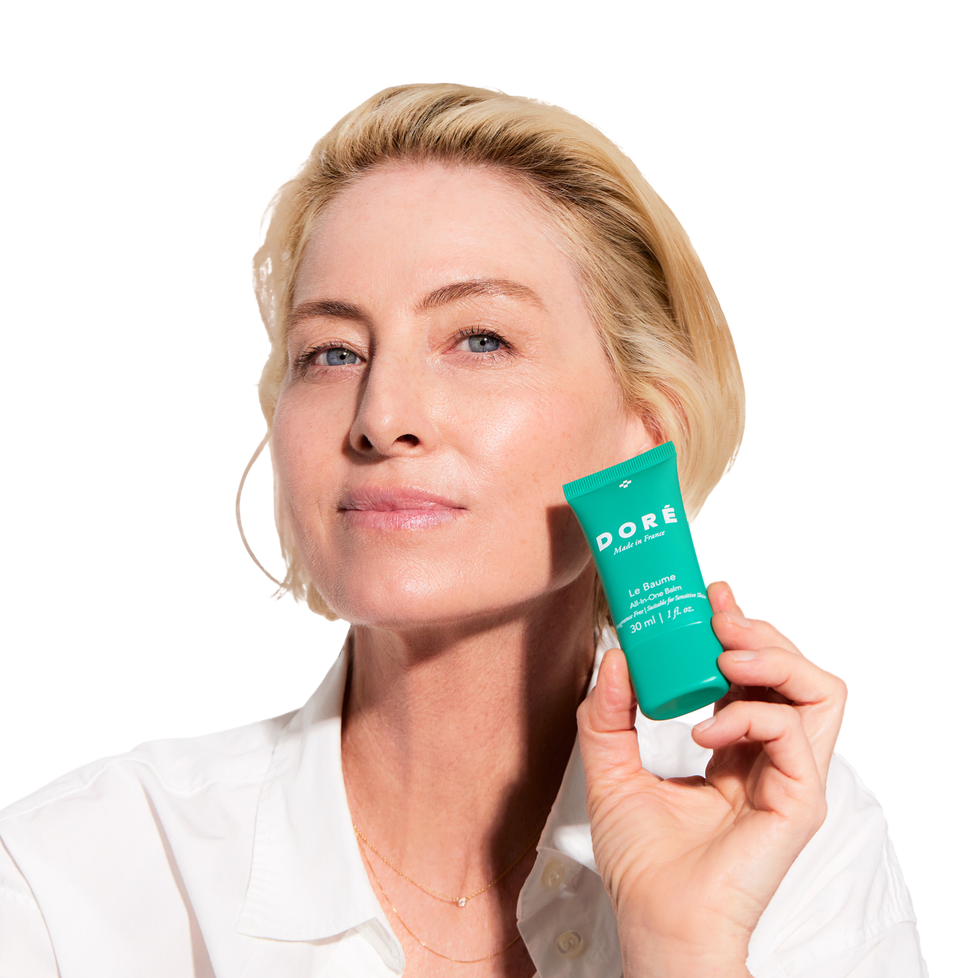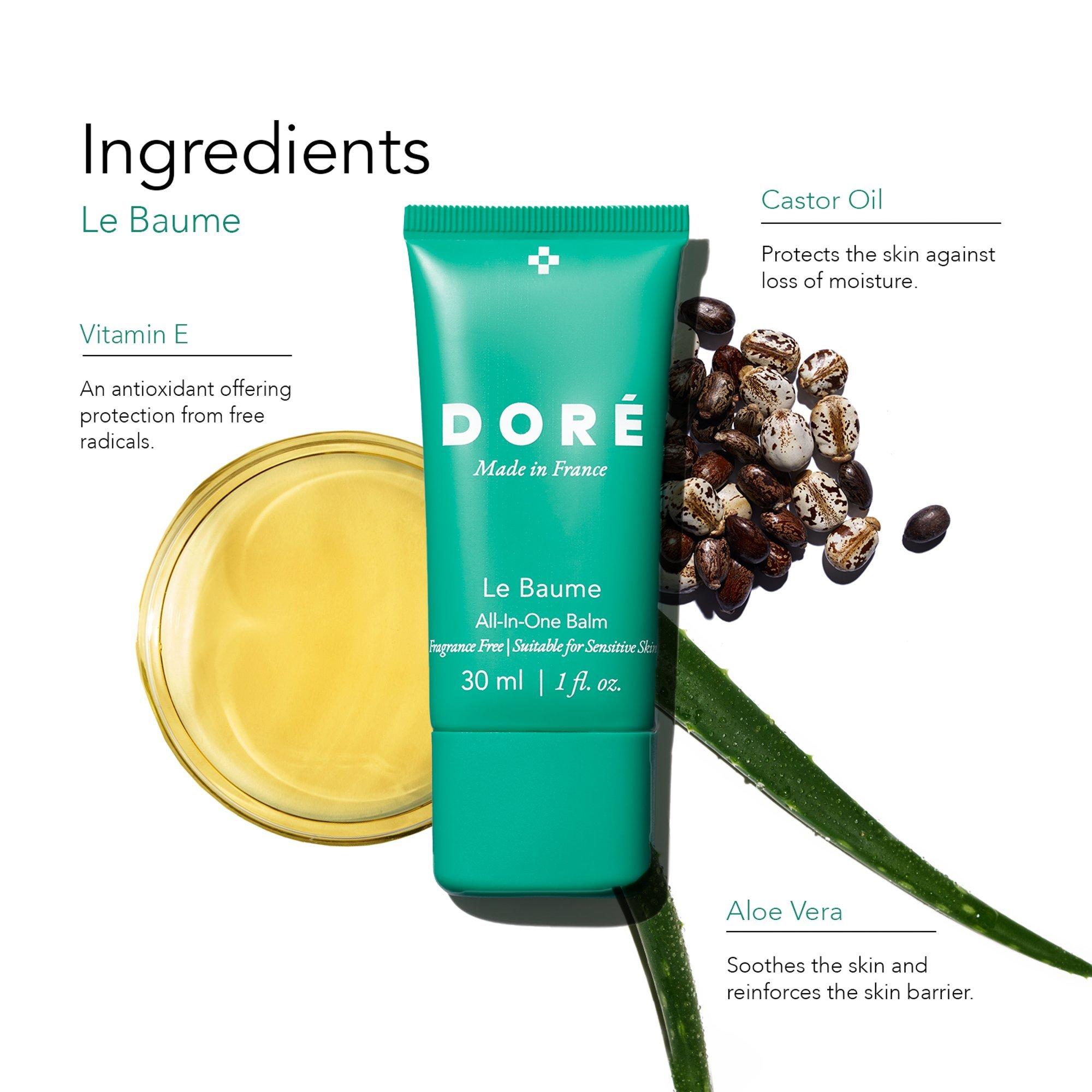Doré's Le Baume All in One Balm is a multi-purpose skin salve formulated with just seven ingredients that is clinically proven to repair the skin barrier and moisturize distressed skin. Use on any area of the body or face that is dry, peeling or chapped. Fragrance-free. Suitable for sensitive skin.