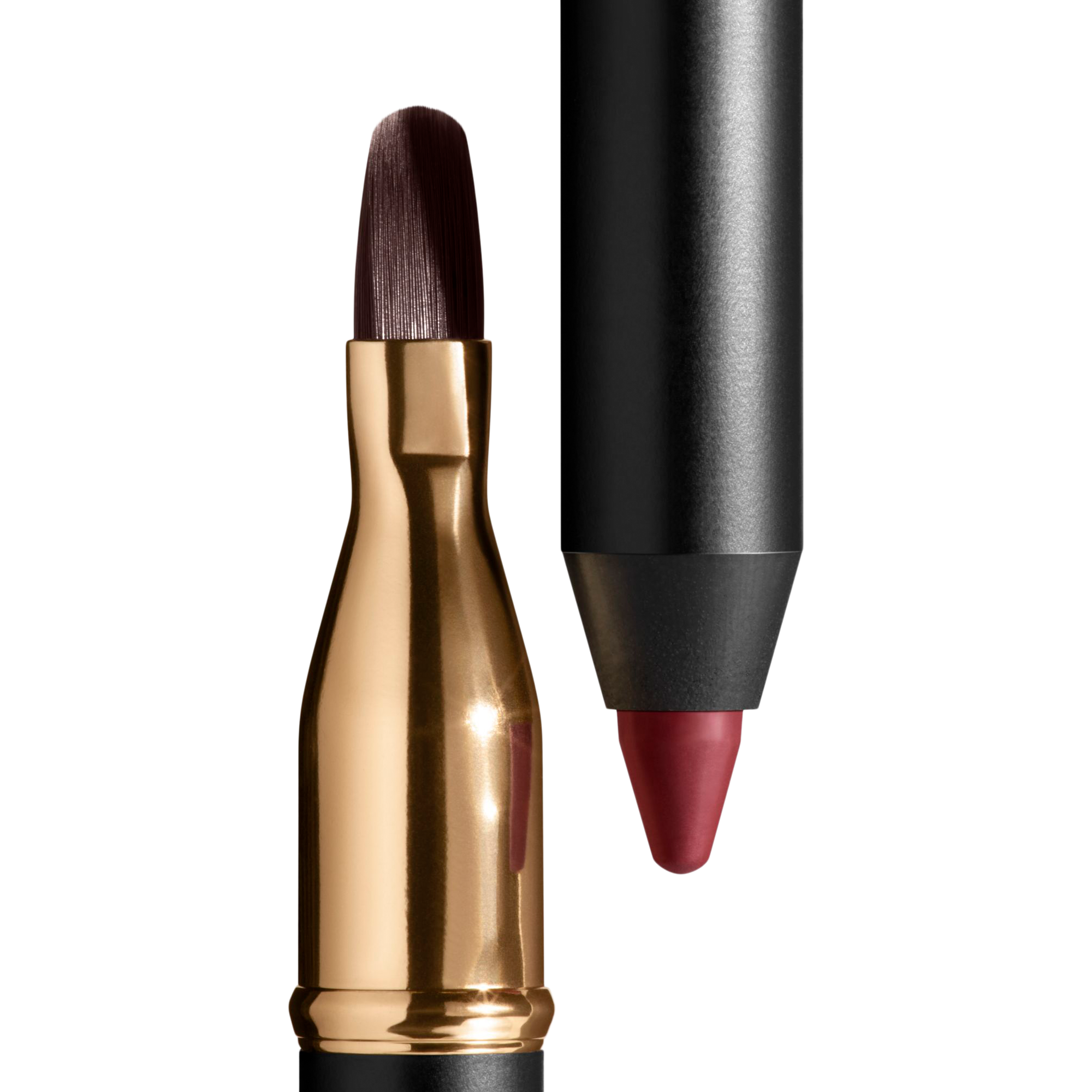 Line the lip contour and fill in, using the bult-in brush to blend out colour. Follow with lipstick for extended wear.