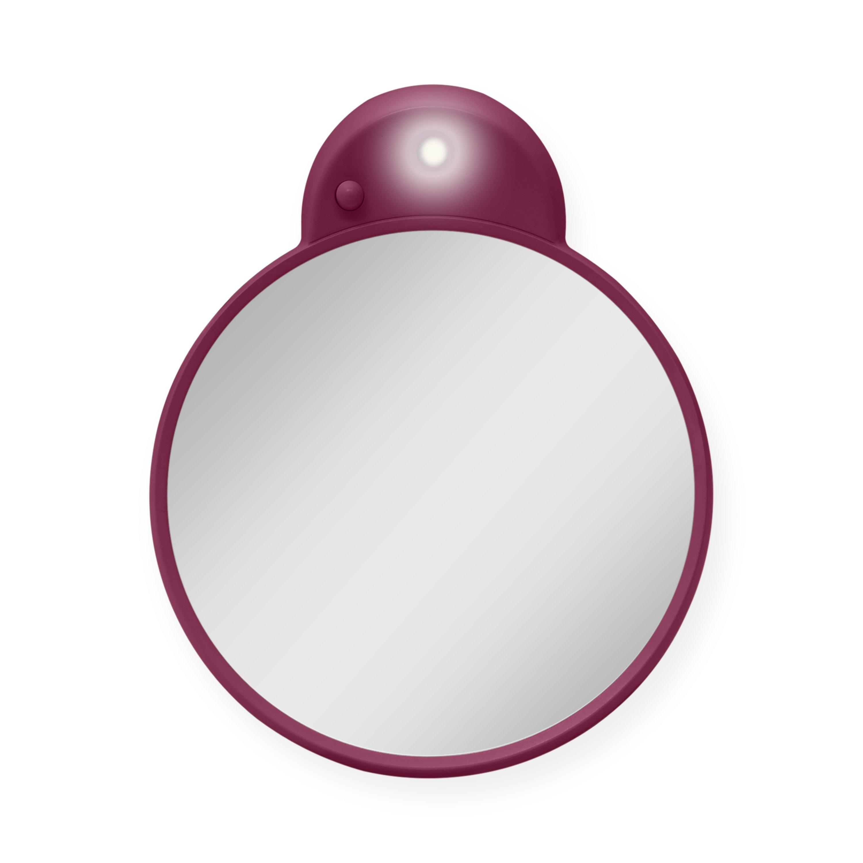LED lighted portable makeup mirror. 10-times magnification glass face mirror. Suction cups mount to most smooth services like glass and tile.