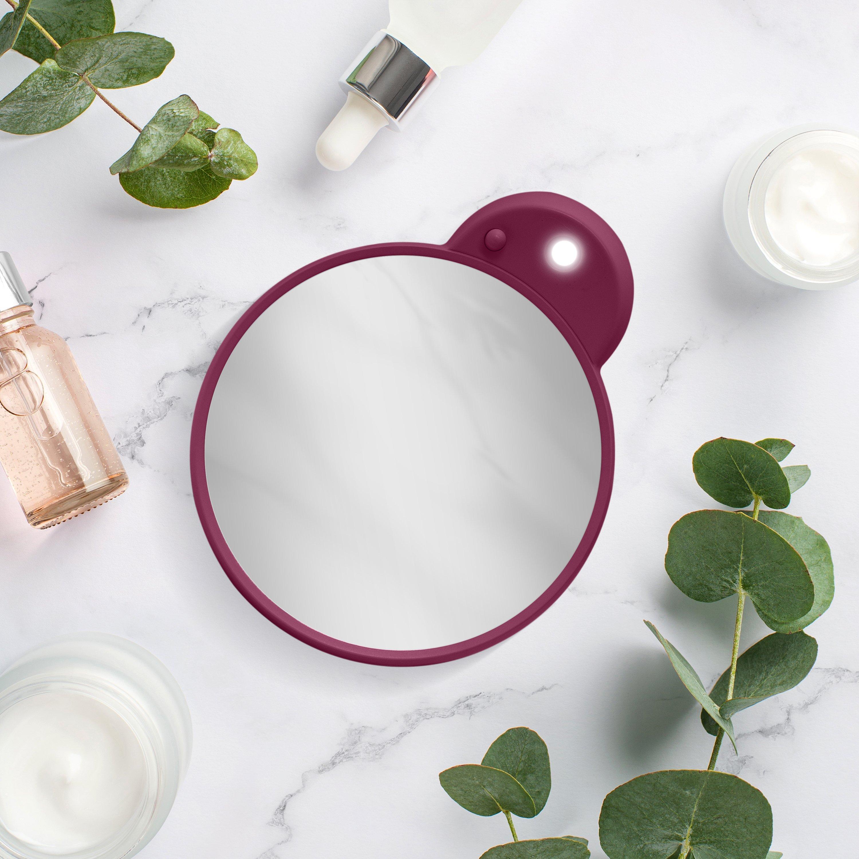 LED lighted portable makeup mirror. 10-times magnification glass face mirror. Suction cups mount to most smooth services like glass and tile.
