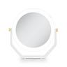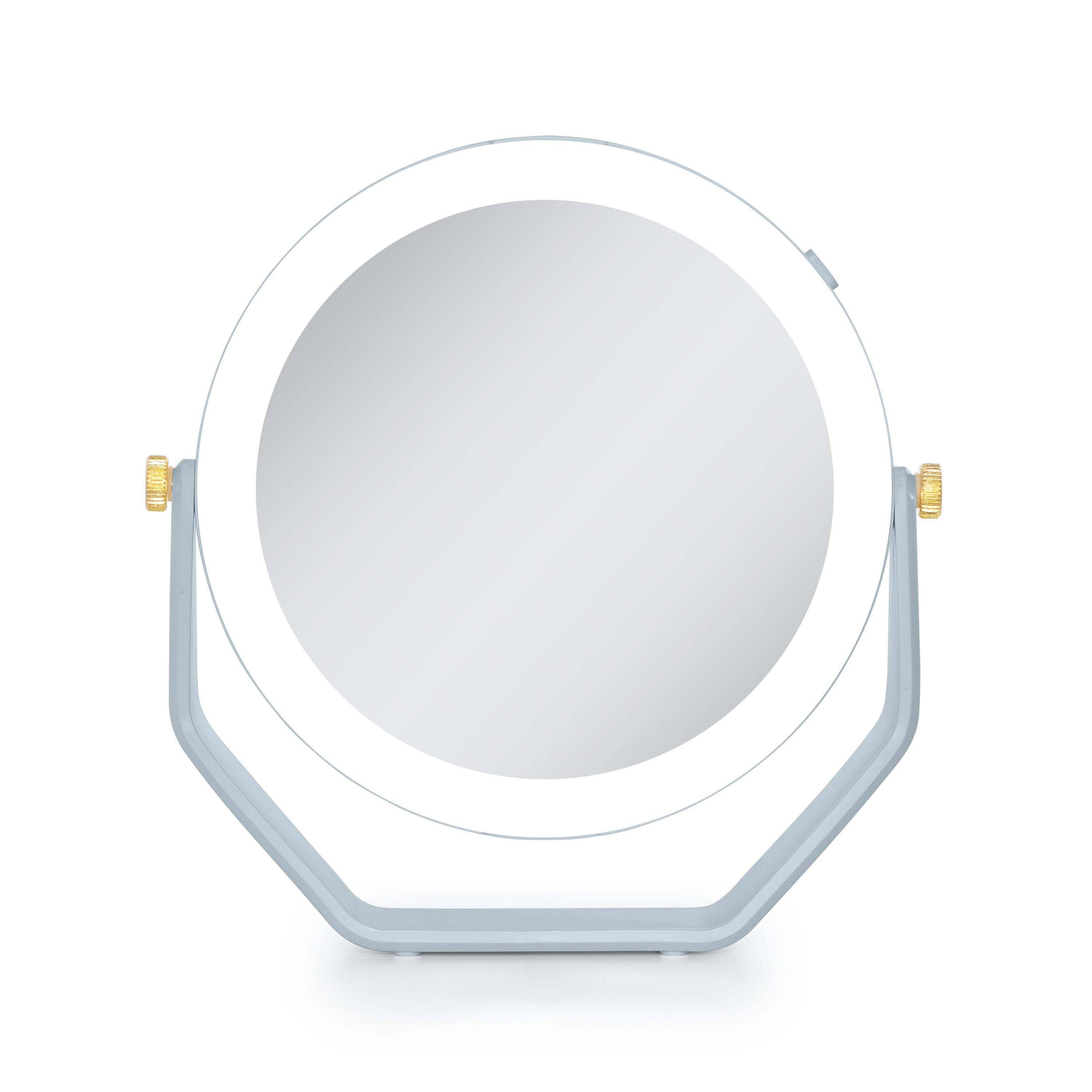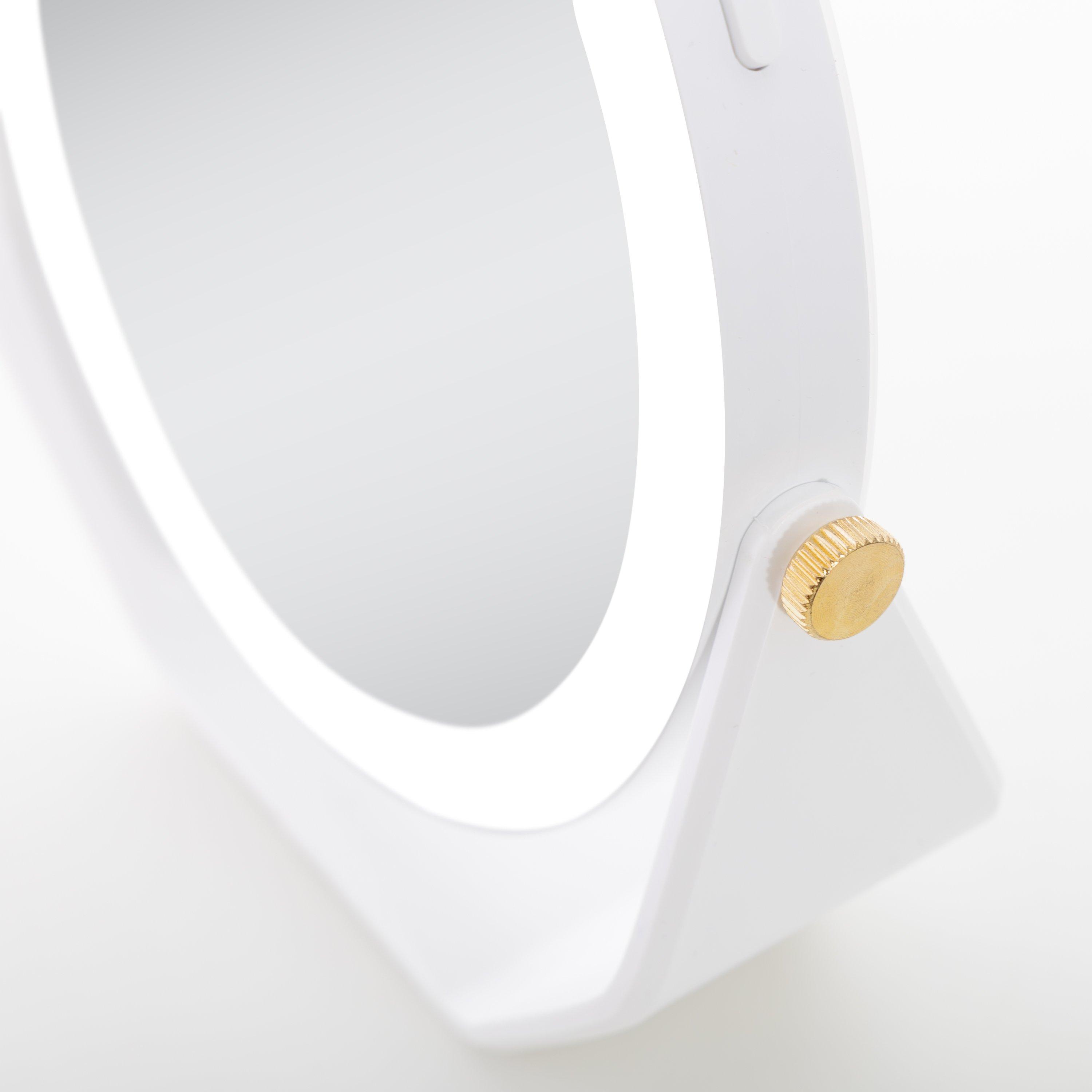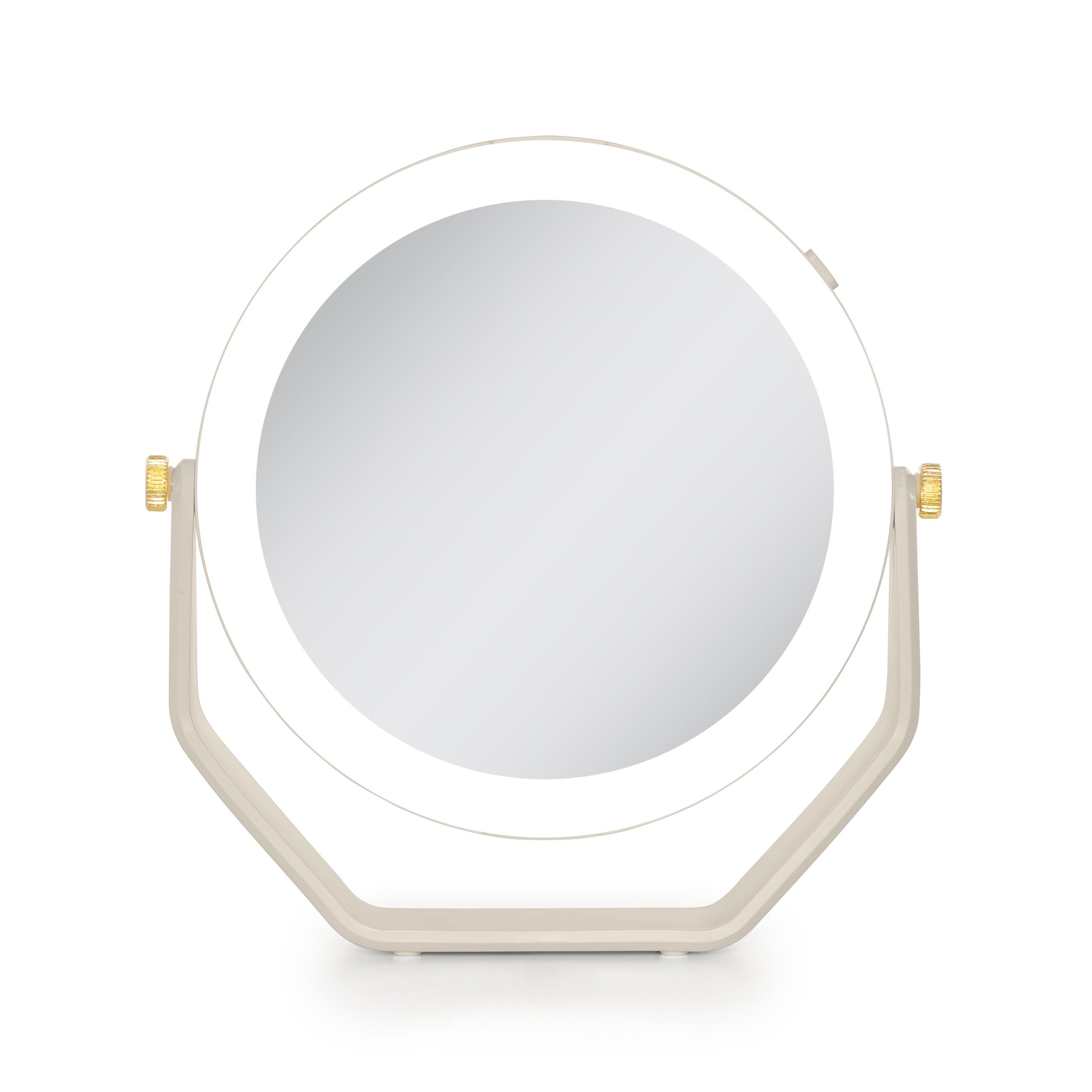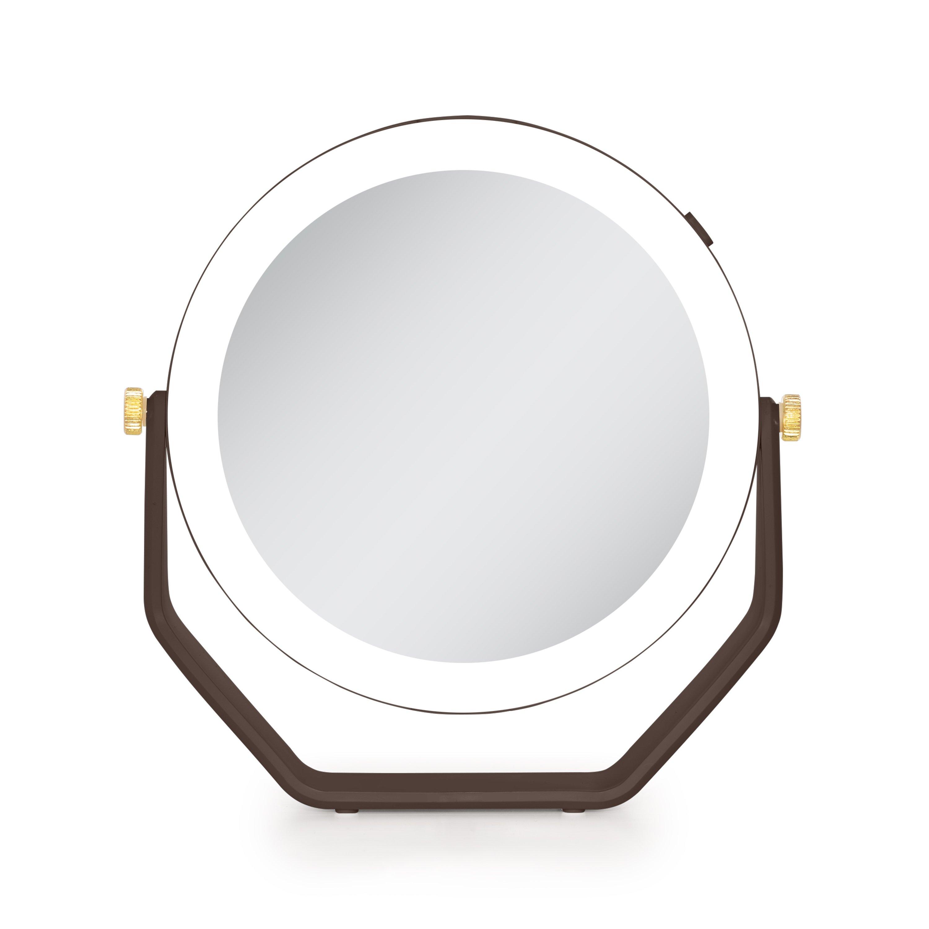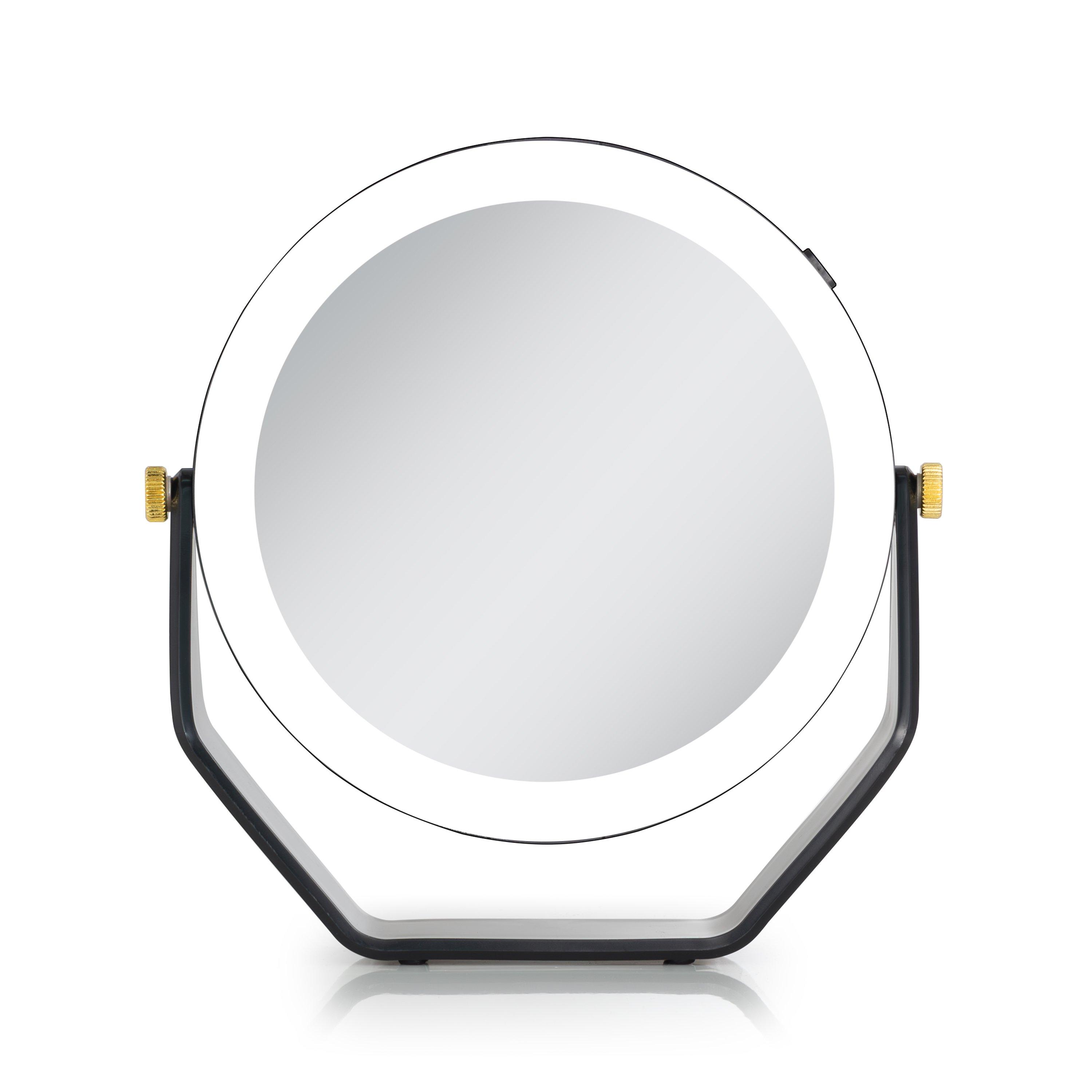 Double-sided 5-times and 1-time magnification mirror with lights. 360 degree rotation beauty mirror head. Cool white LED ring lighting. Stylish gold joint accents. Easy-touch On/Off button. 5.75-inch dia. glass mirror head. 5 AAA batteries required.