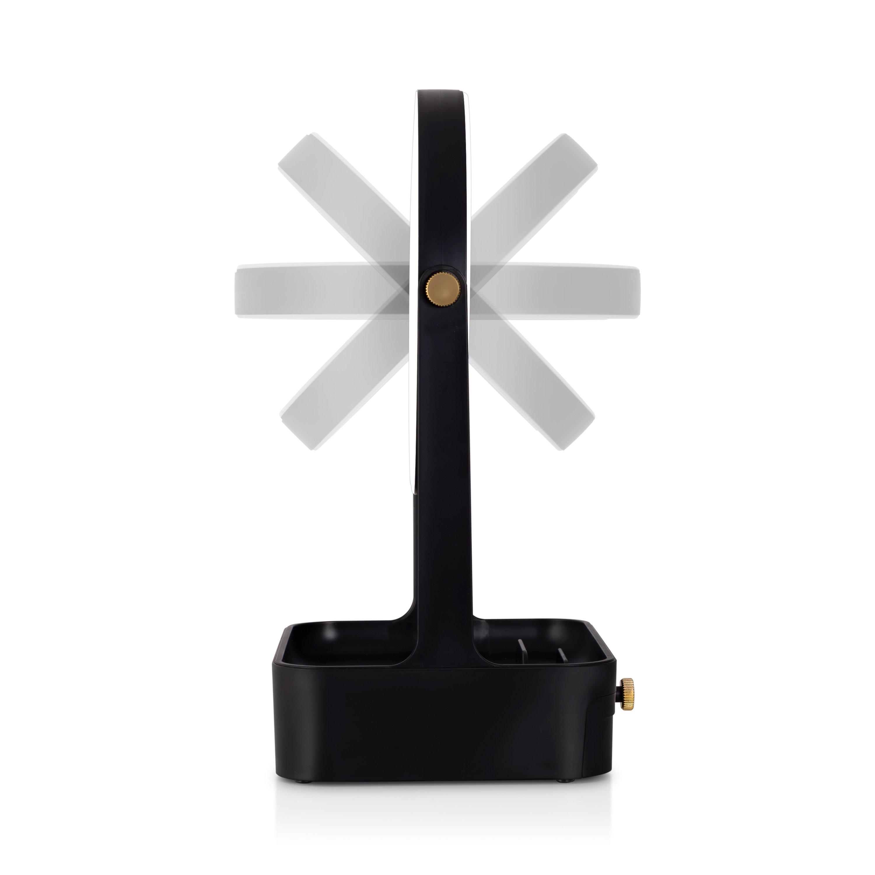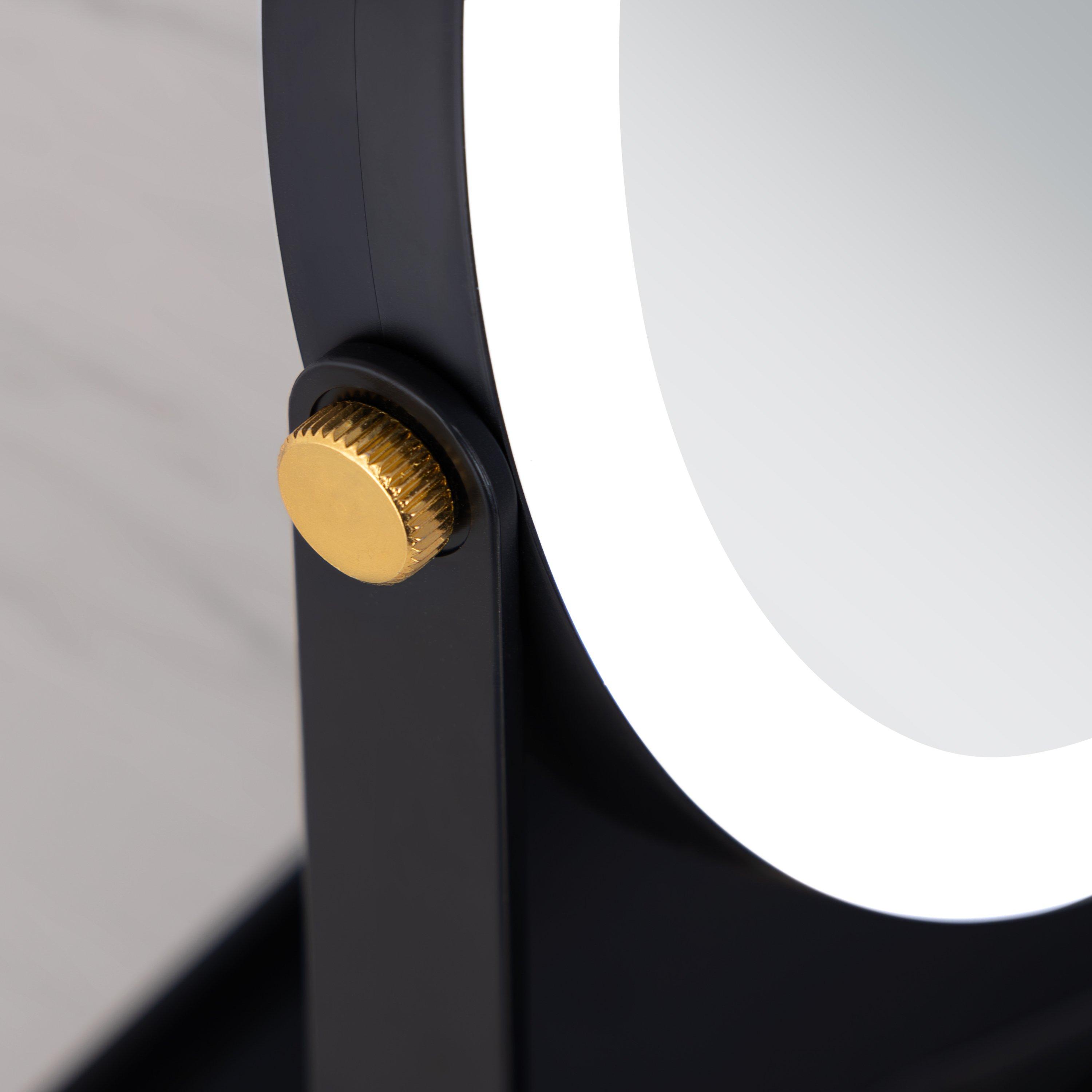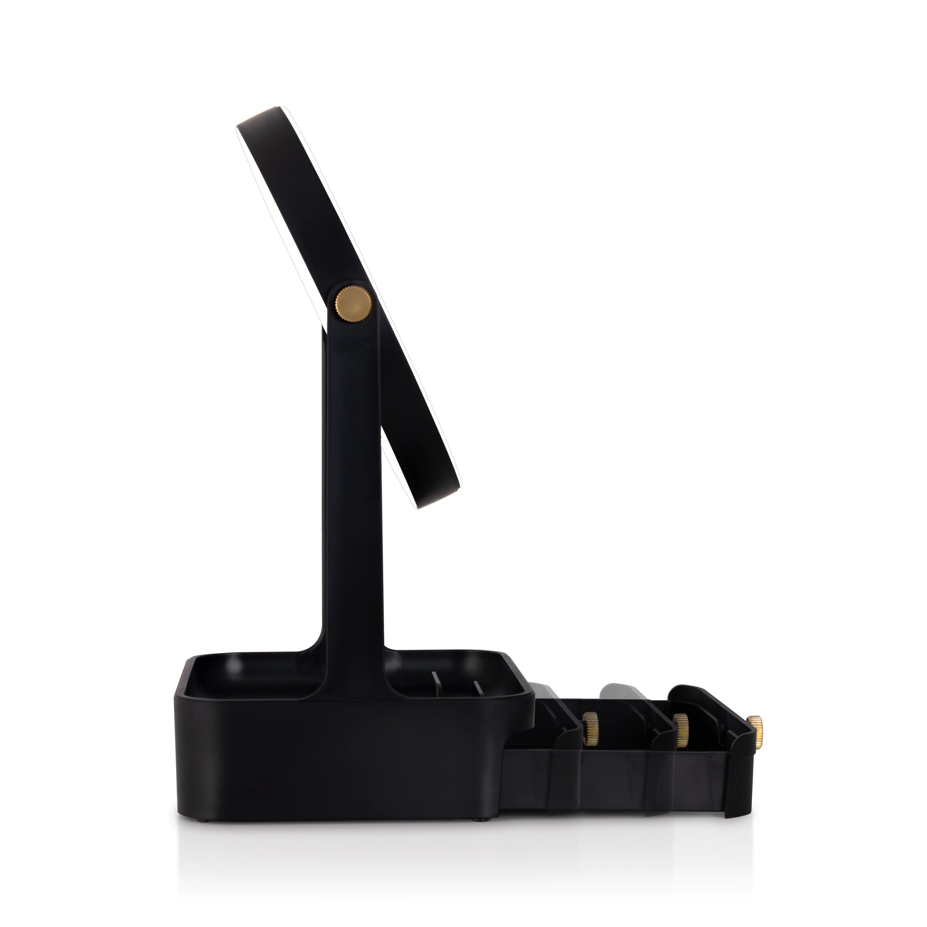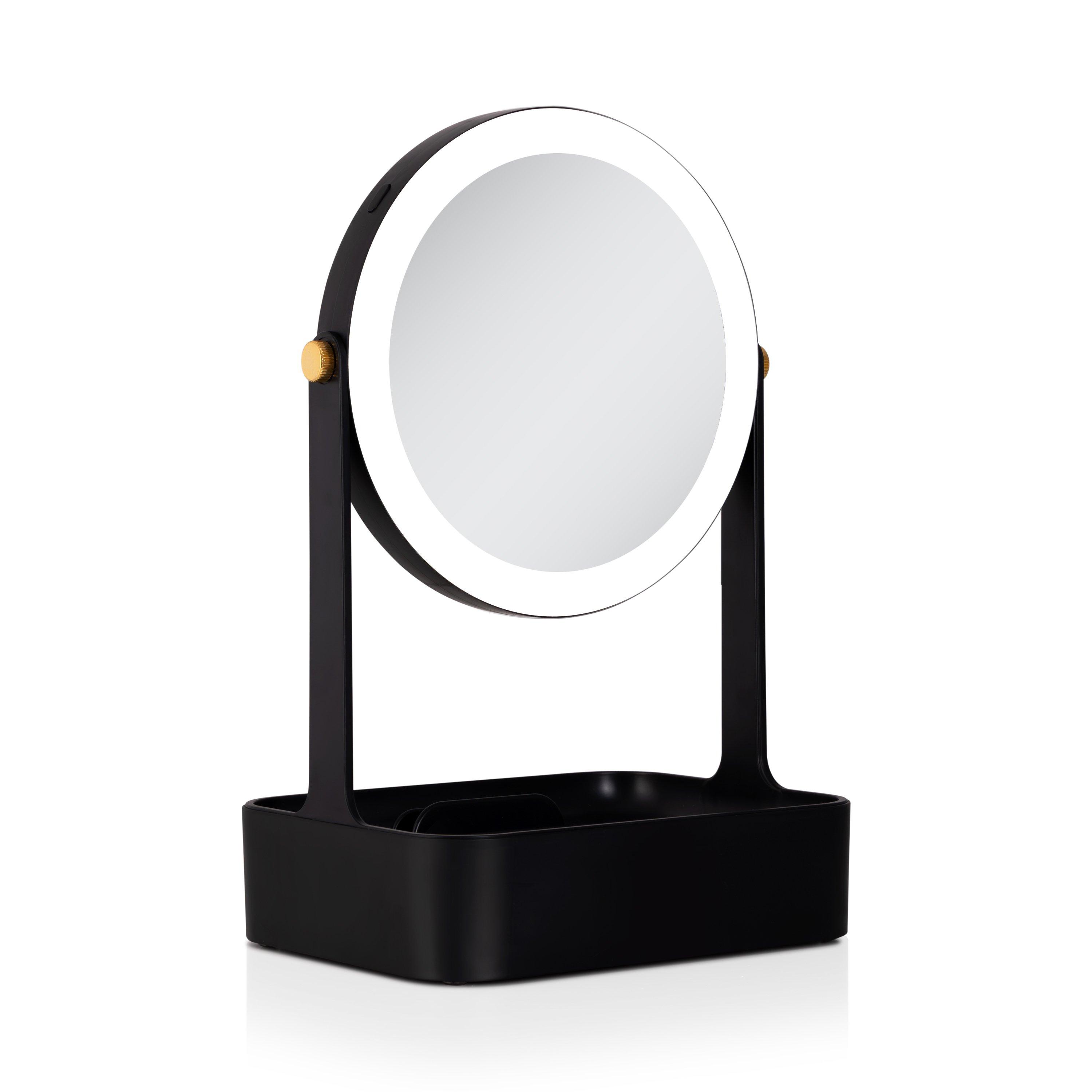 5-times and 1-time magnification makeup mirror. 360-degree swiveling mirror head. 5.75-inch dia. glass face mirrors. Built in storage drawer. Accessory tray with built in phone stand. Cool white ring lighting. Stylish gold joint accents. Easy-touch On/Off button. 5 AAA batteries required.