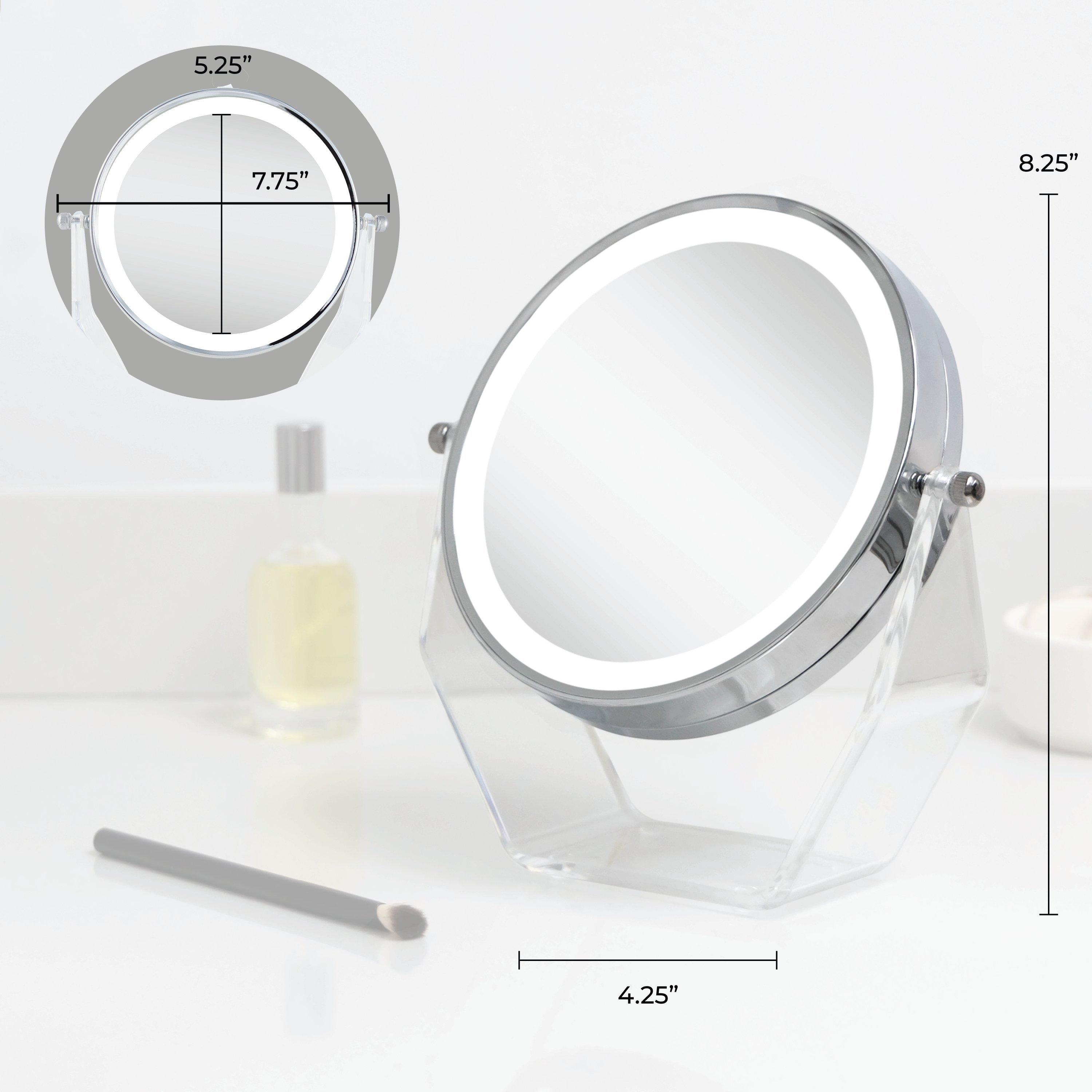 7.75 inches wide by 2.5 inches deep by 8.25 inch tall. LED right lighted women's beauty mirror. 360-degree swiveling bathroom mirror head. Dual sided 8-times and 1-time magnification mirror with lights. Cordless, 4 AAA batteries included.