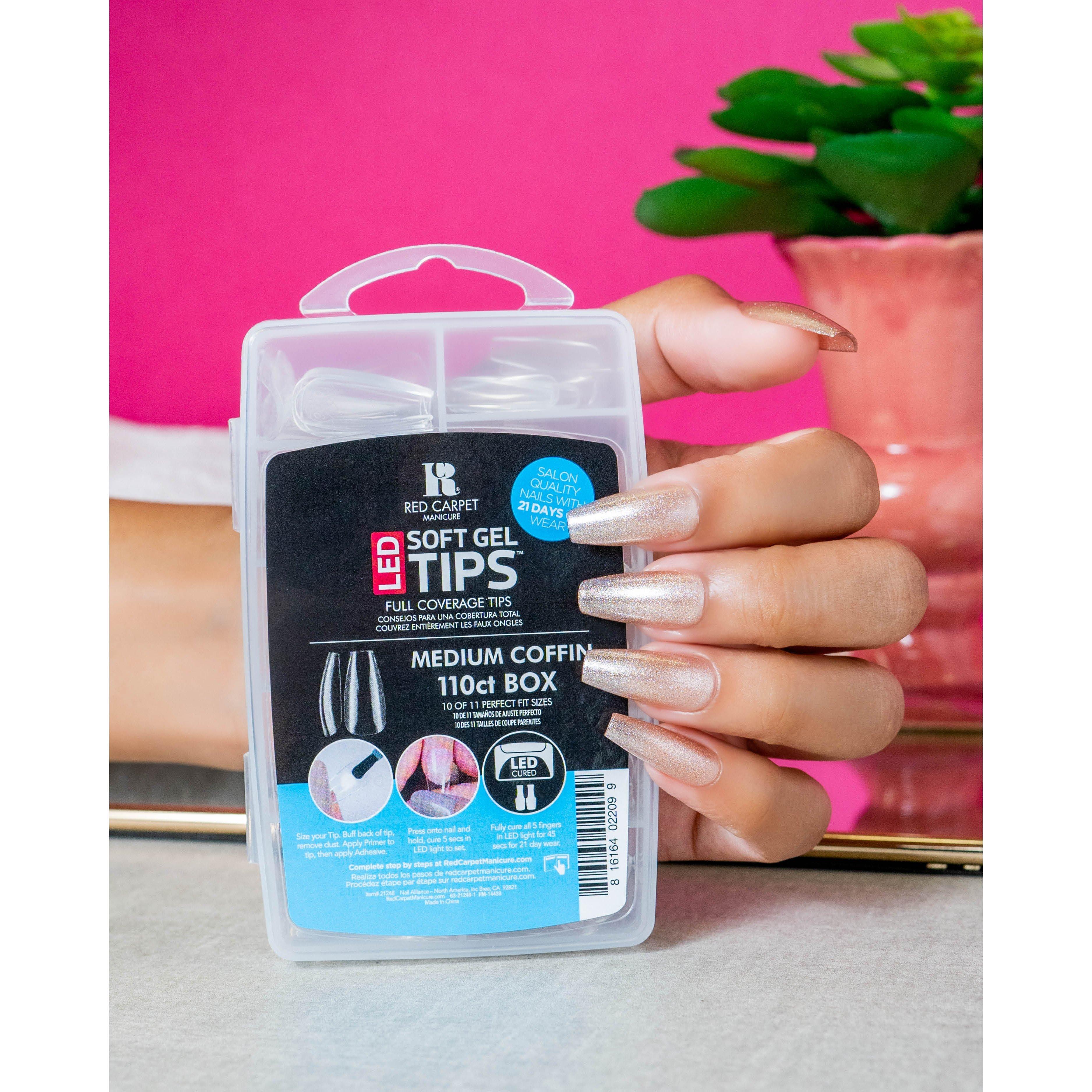 Red Carpet Manicure LED Soft Gel Medium Coffin Tips are full coverage ready to wear nails. Faster and longer wearing than press on nails.