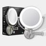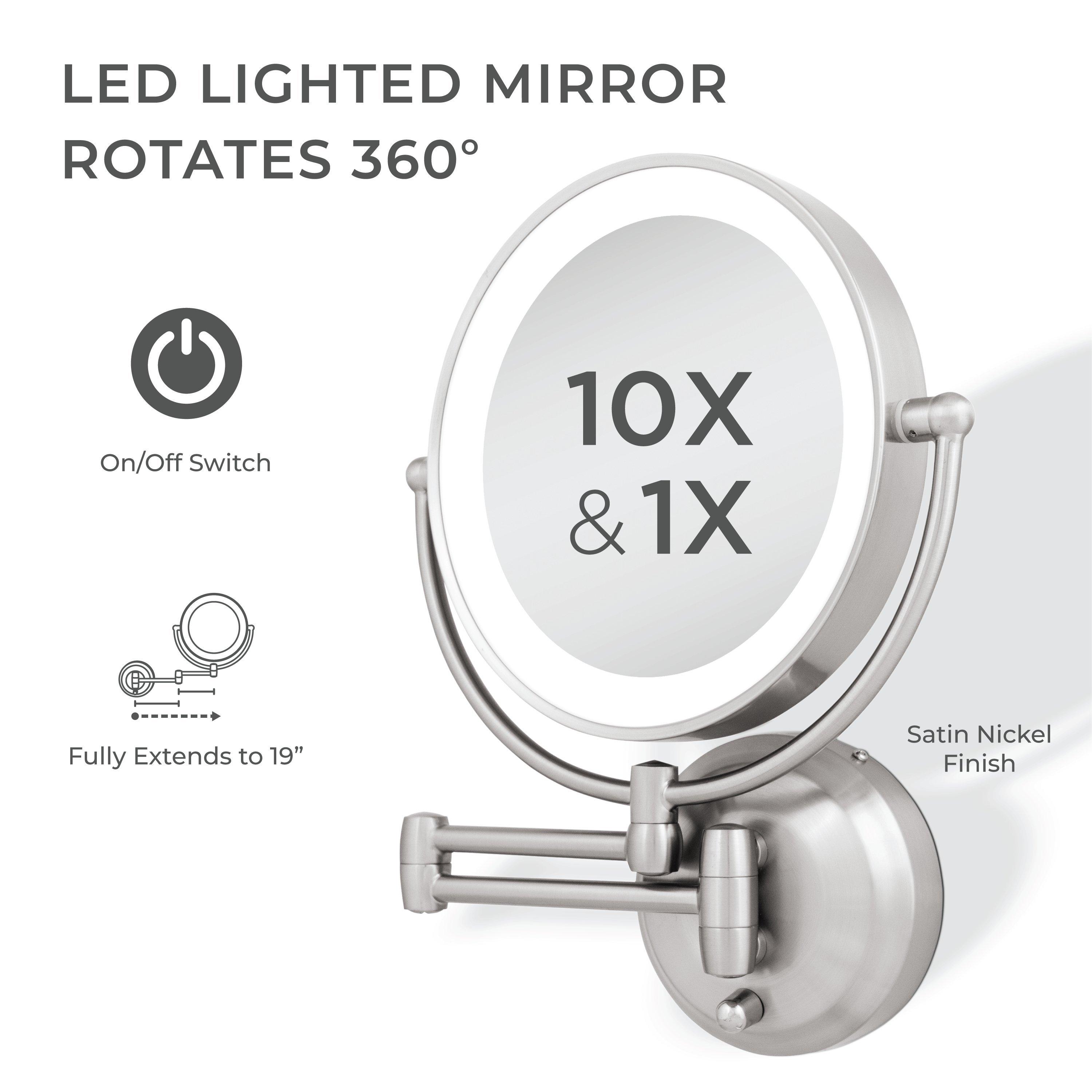 11 inch by 14.5 inch. ON/OFF switch knob. 9-inch dia. 360-degree swiveling head. 6400K day light ring light. 7-inch dia. glass face mirror. 10-times and 1-time magnification. 18.5-inch extending arm. 5-inch dia. mounting plate. Both 4 C Batteries or adapter power options. Not rechargeable.