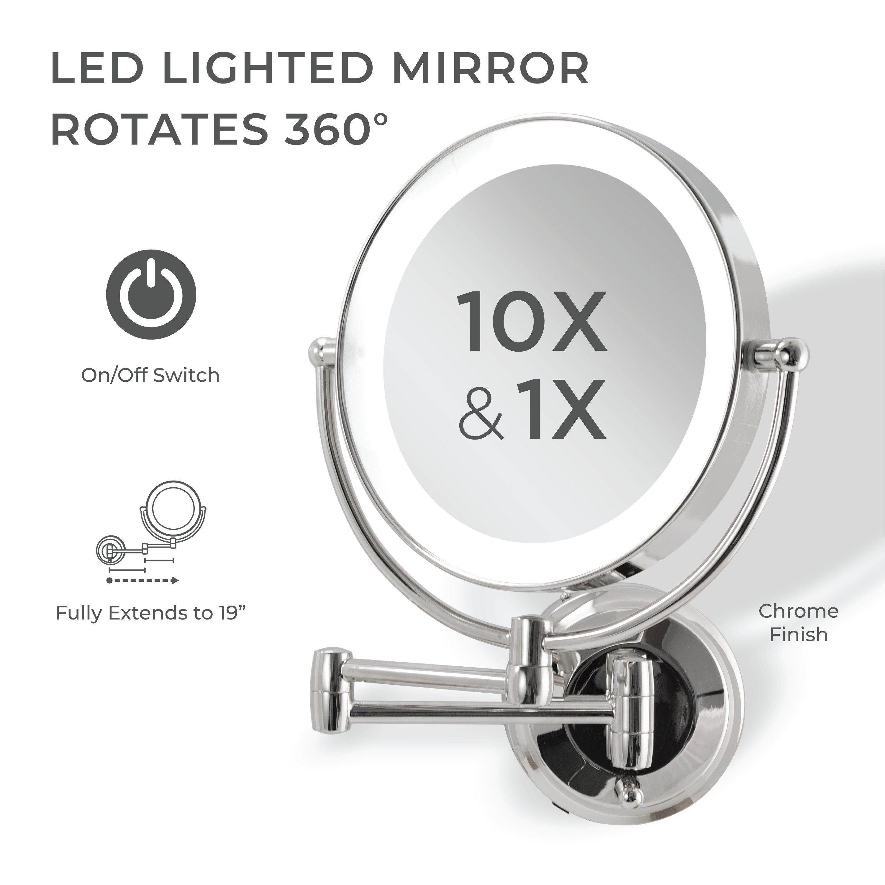 11 inch by 14.5 inch. ON/OFF switch knob. 9-inch dia. 360-degree swiveling head. 6400K day light ring light. 7-inch dia. glass face mirror. 10-times and 1-time magnification. 18.5-inch extending arm. 5-inch dia. mounting plate. Both 4 C Batteries or adapter power options. Not rechargeable.