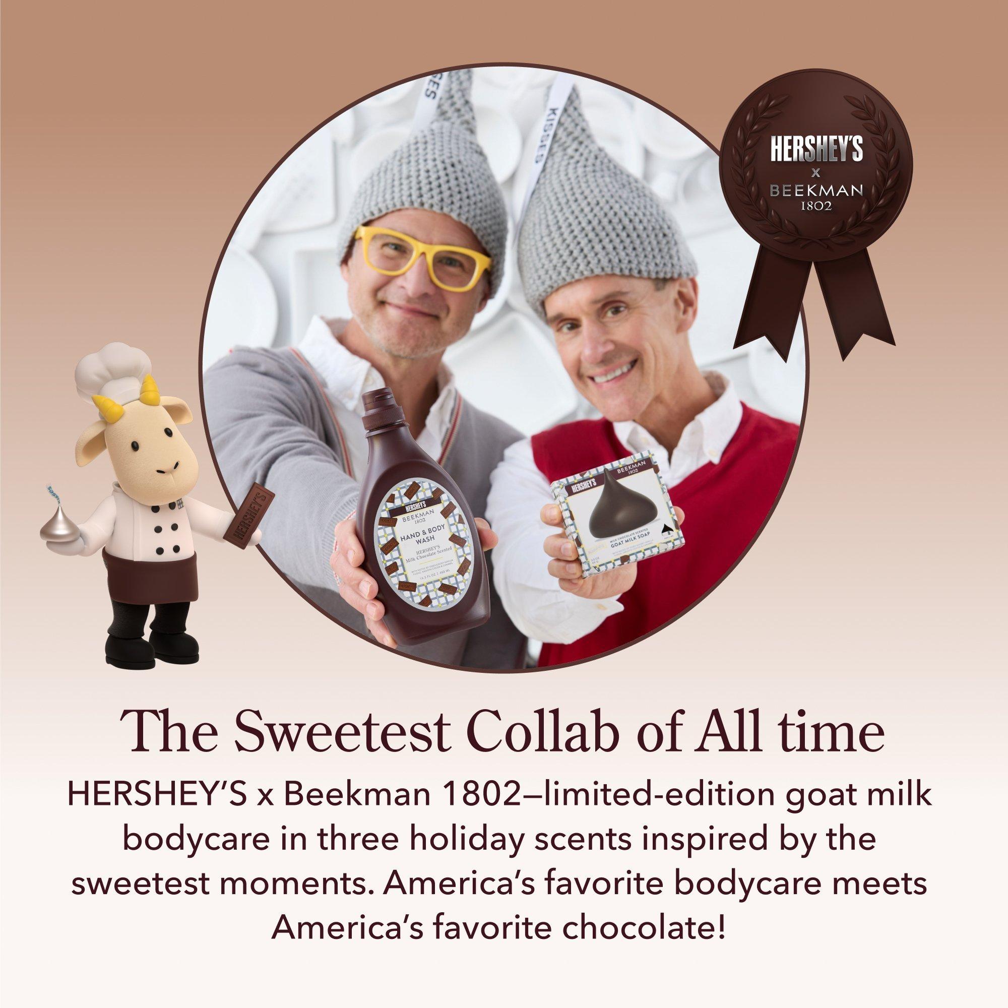Beekman 1802 x HERSHEY'S KISSES Goat Milk Soap pampers skin with a gentle, nourishing cleanse while leaving behind an irresistible scent.