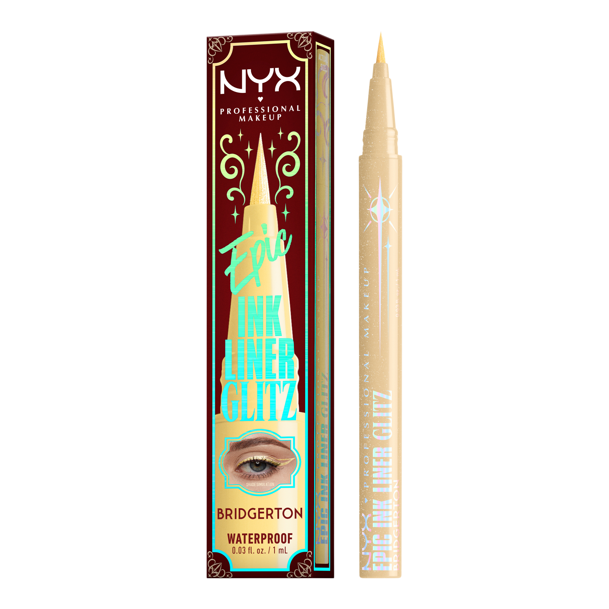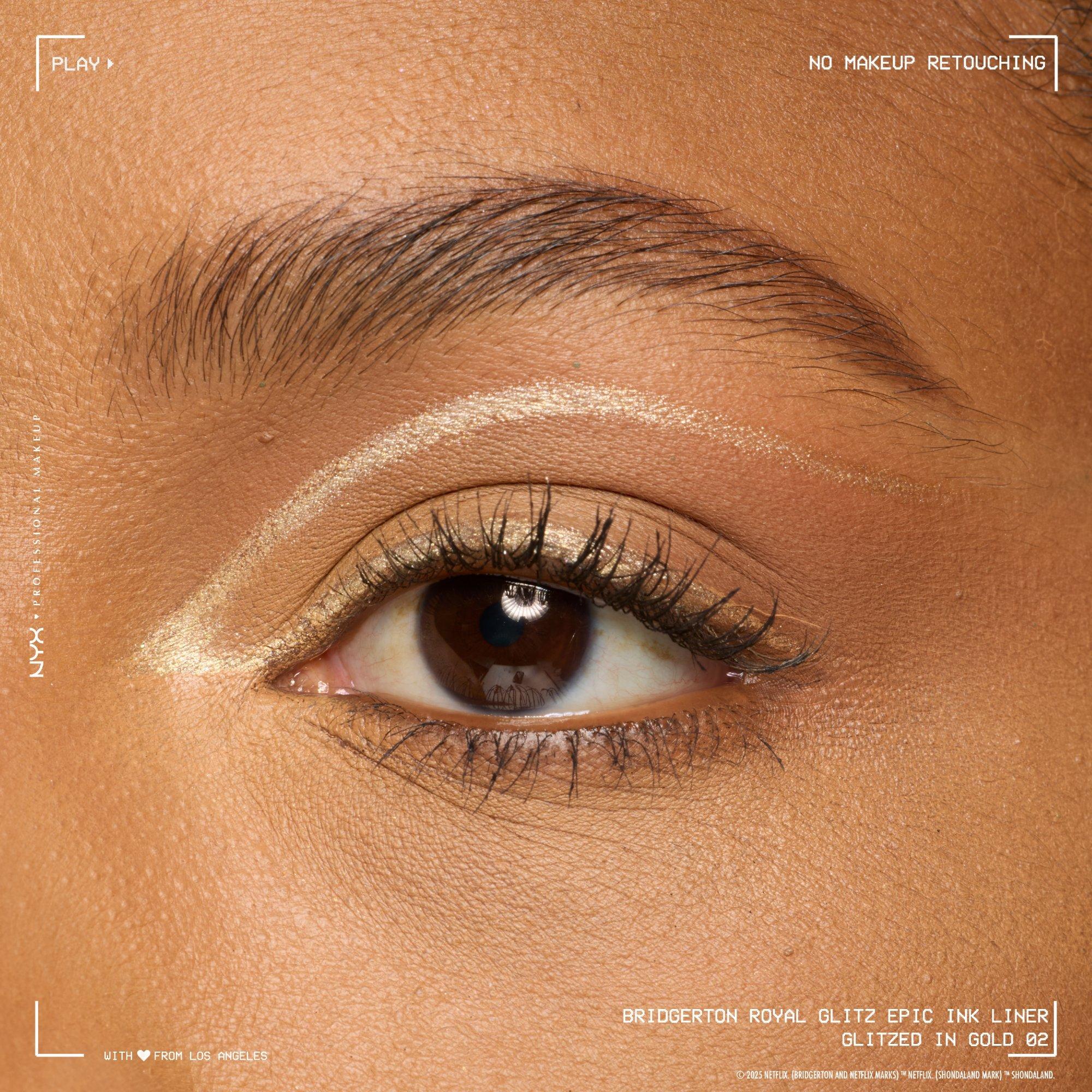 Rule the room with NYX Professional Makeup Bridgerton Royal Epic Ink Liner Glitz! Ultra-precise brush tip delivers sharp lines and bold sparkle.