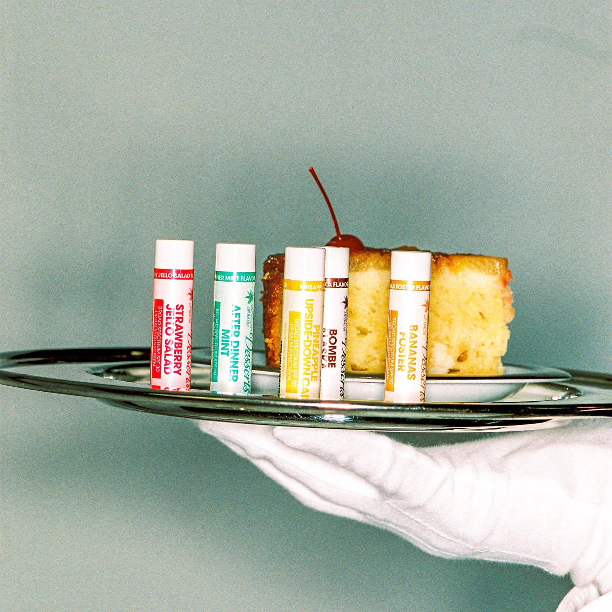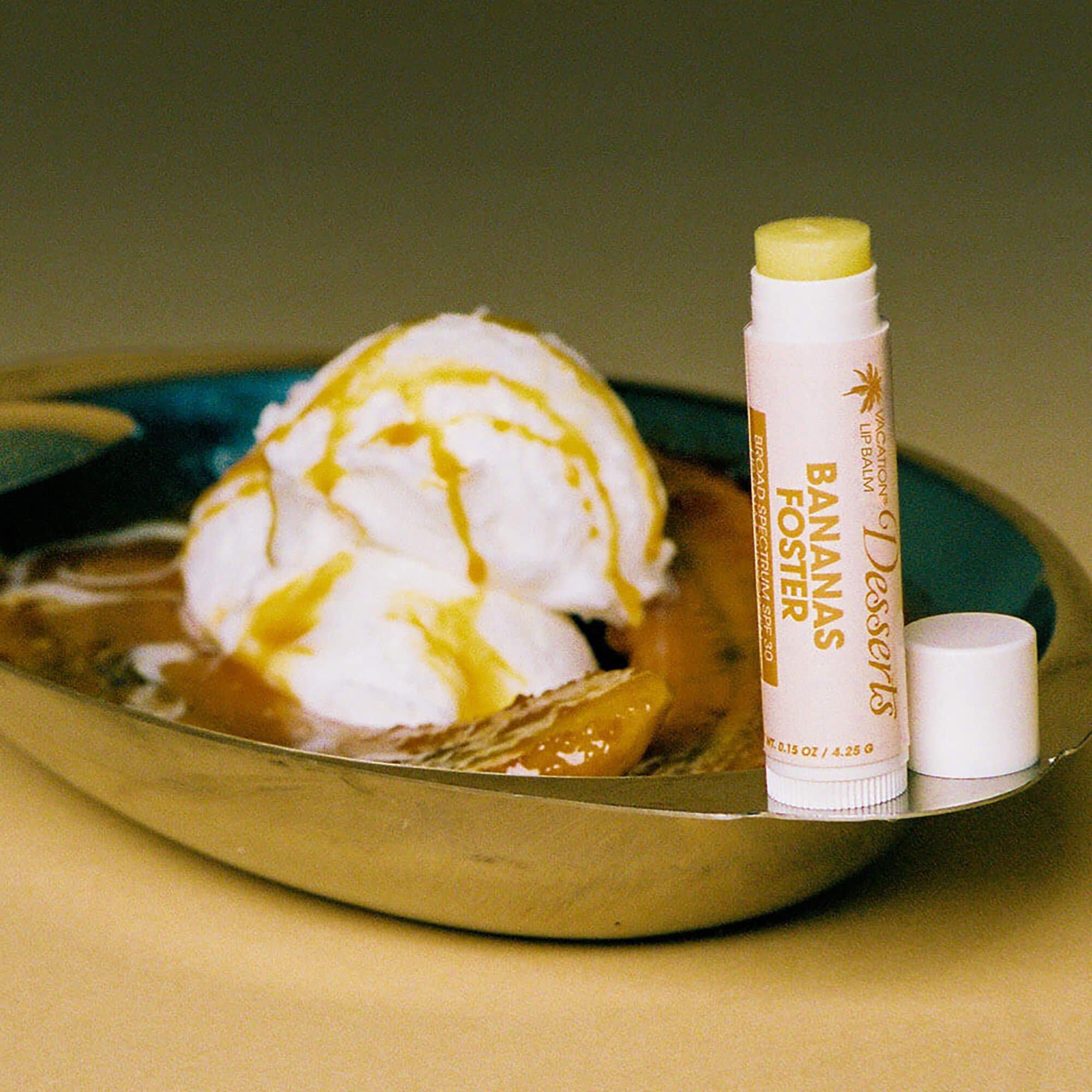 Vacation's mouth-watering SPF 30 Sunscreen Lip Balms inspired by legendary desserts from across the globe. Made with Coconut Oil, Jojoba, Cocoa Butter, Aloe Vera, and Vitamin E, these SPF30 delicacies boast first-class flavor, lip nourishment, and broad spectrum protection.