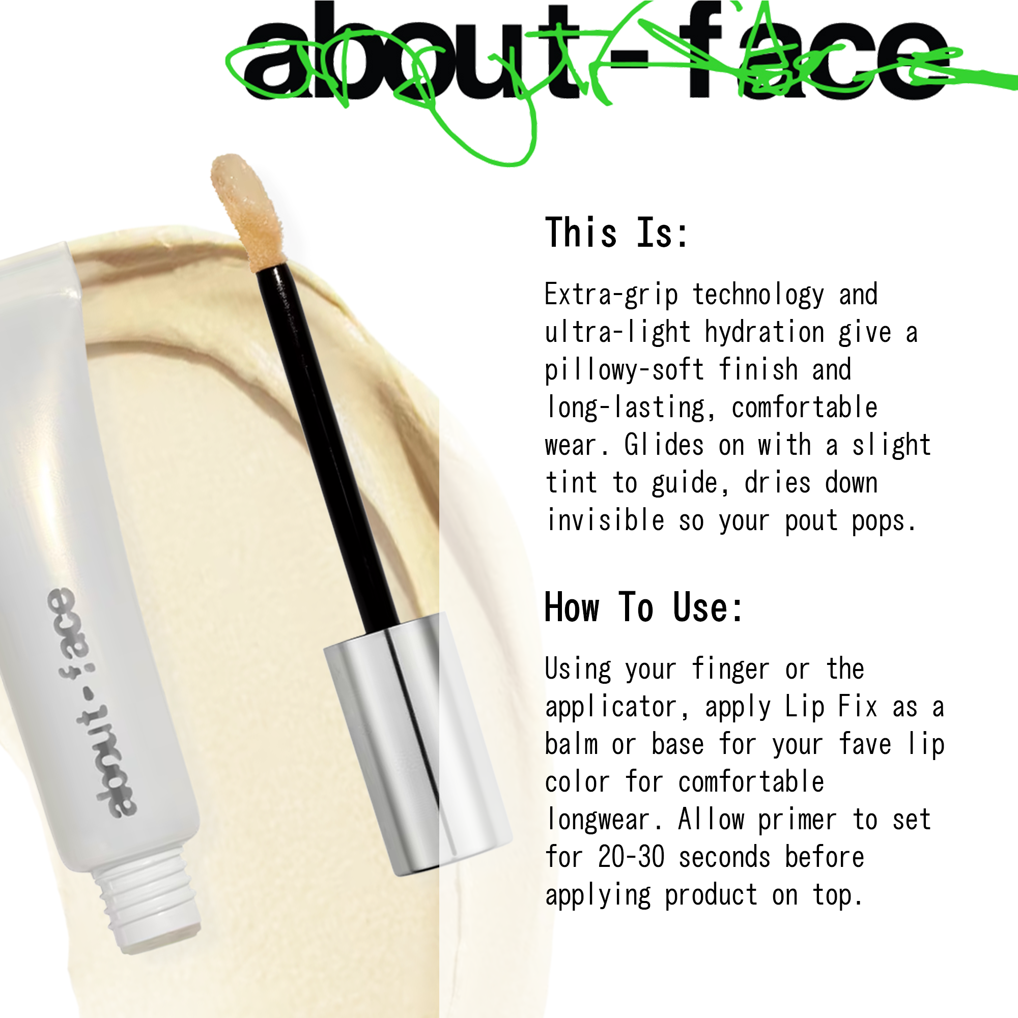 About-face Lip Fix Lip Primer: wrap your lips in soothing hydration with this lightweight, lip-conditioning formula to prep + prime your pout.