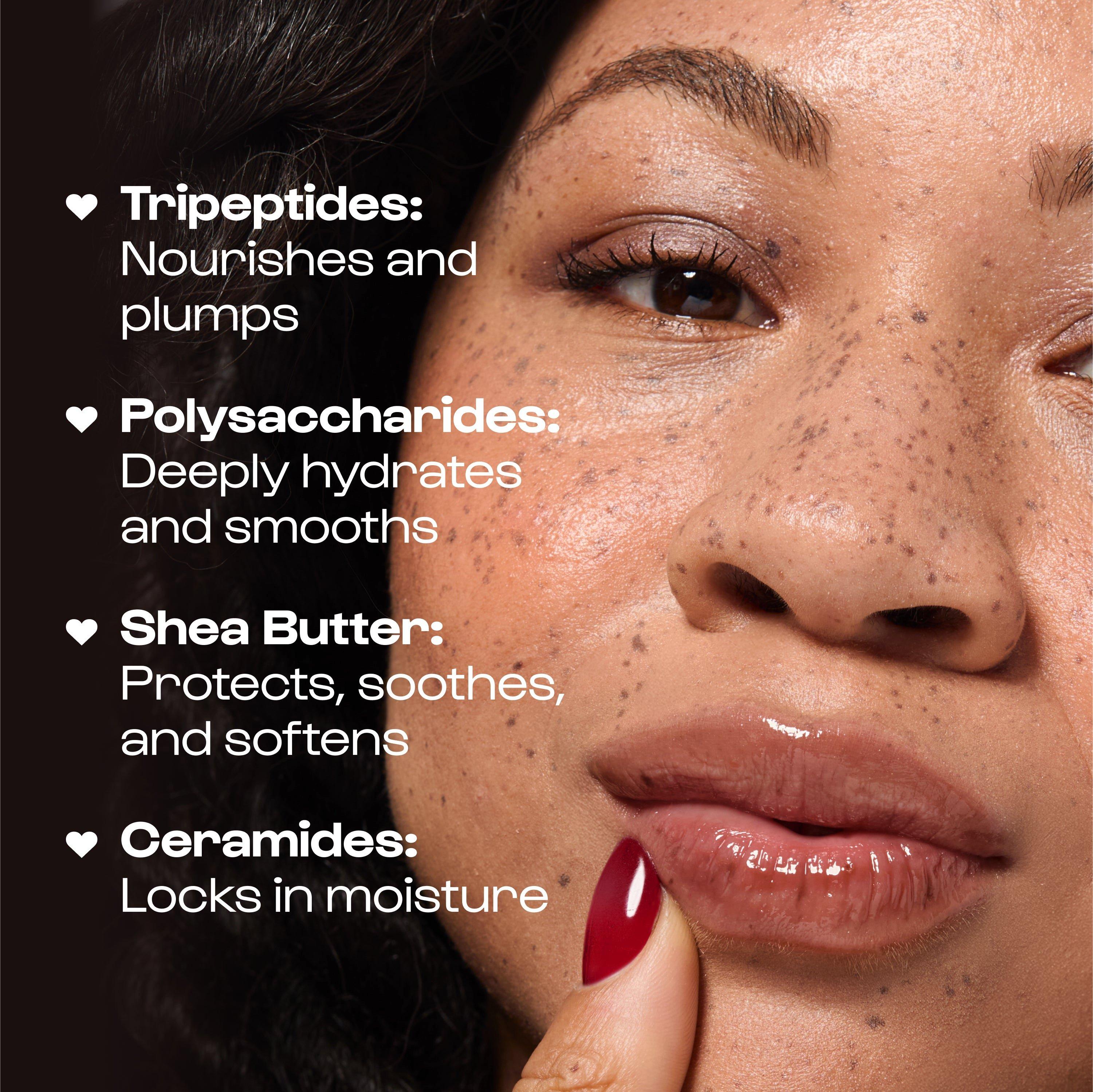Hydrating lip gloss with a silkier, velvety texture. Delivers rich moisture, glassy shine, and sheer color in juicy shades. Infused with Peppermint Oil and Vanilla for a fresh, plumped feel, plus vitamin-packed ingredients for softer, smoother, pillowy lips.
