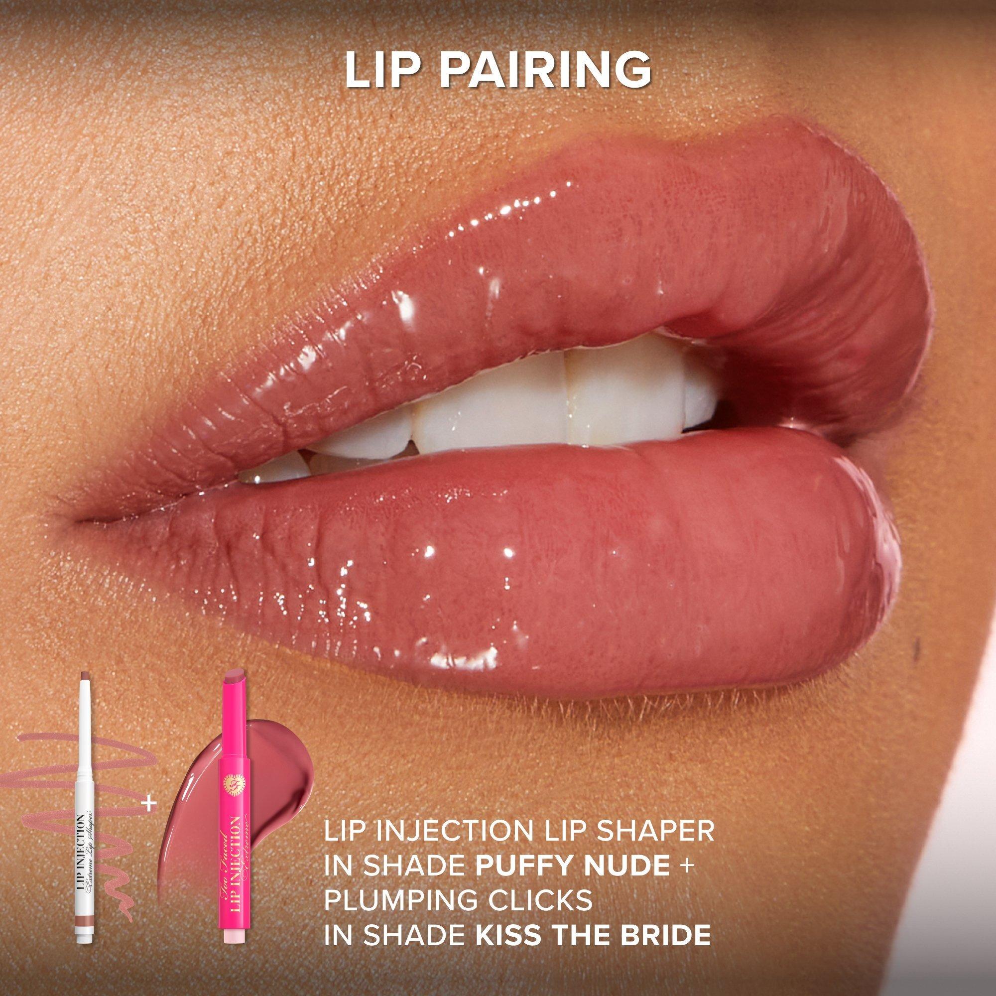 Too Faced's strawberry-scented, glossy Lip Injection Extreme Plumping Clicks delivers sheer-to-medium buildable color + 8 hours of hydration with just one click. The creamy formula melts on, plumps lips instantly, and leaves them with gorgeous shine and a kiss of color.