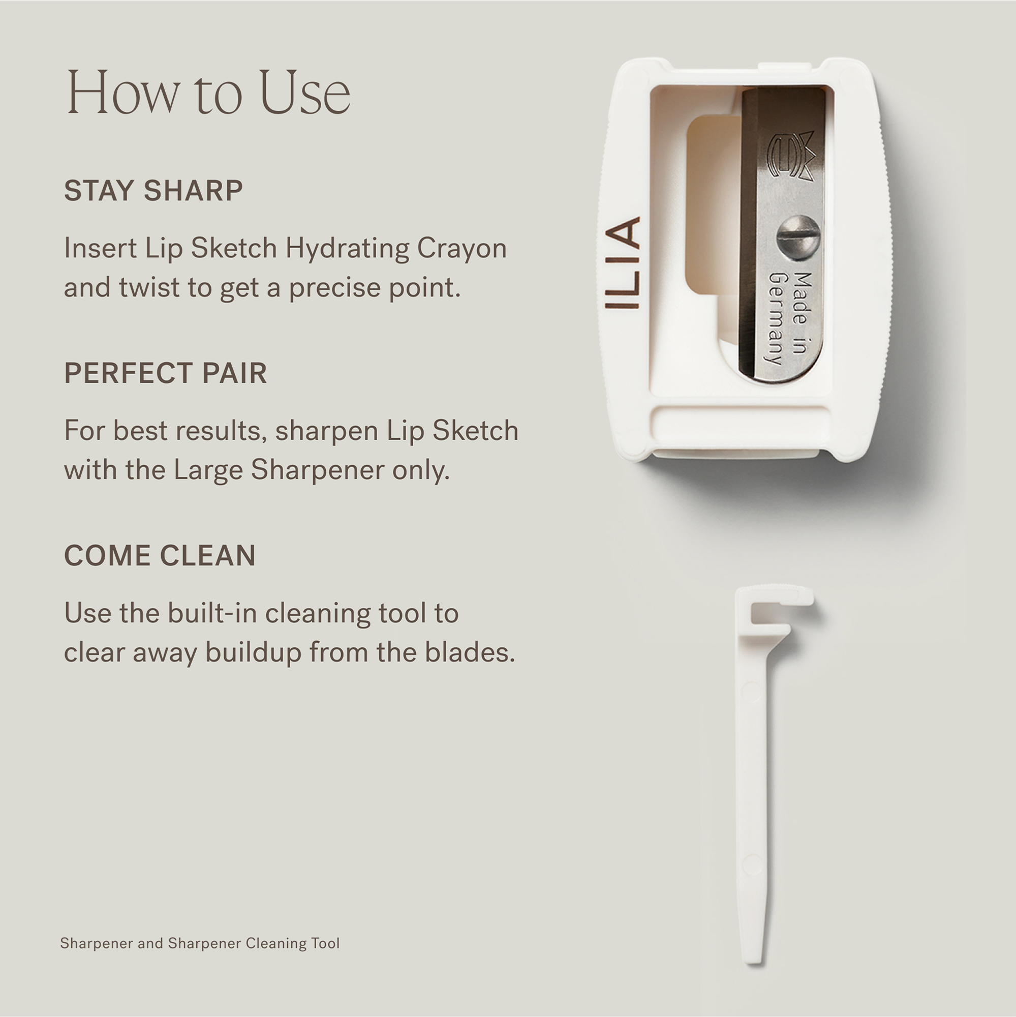 Insert ILIA Lip Sketch Hydrating Crayon and twist to get a precise point. Use the built-in cleaning tool to clear away buildup from the blades. For best results, use the Large Sharpener with Lip Sketch only due to its unique size.