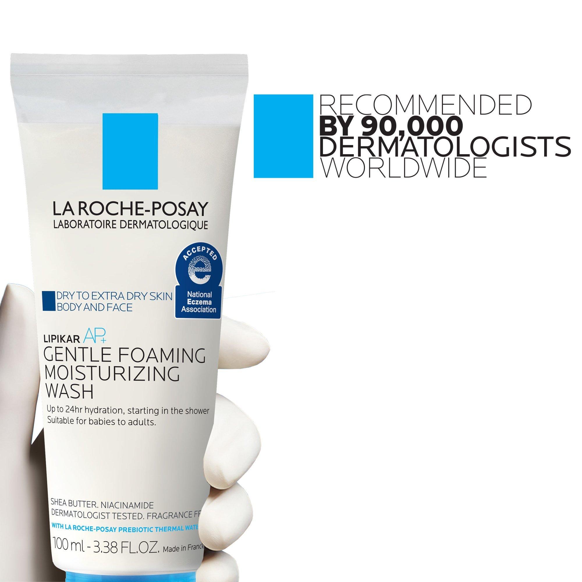 La Roche-Posay Lipikar Wash AP+ Gentle Foaming Moisturizing Wash is a hydrating face cleanser and body wash that provides 24-hour hydration for dry skin.