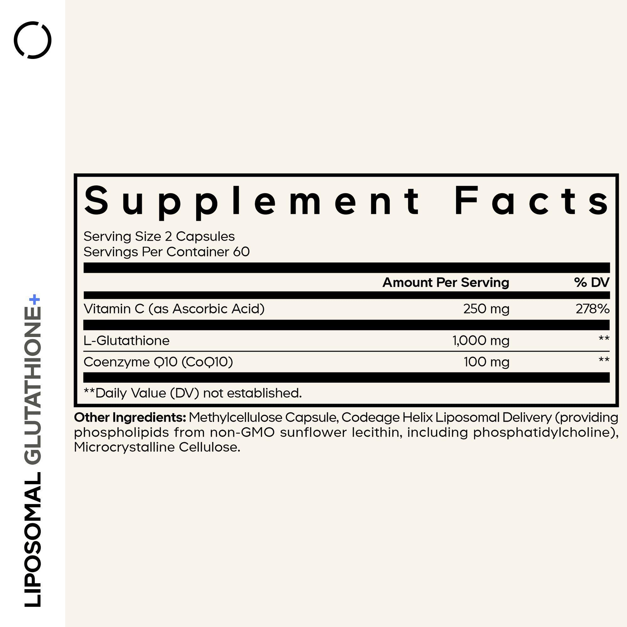 Codeage Liposomal Glutathione+ provides 1000 mg of reduced L-Glutathione per serving in a liposomal capsule format, matching your search for a liposomal glutathione supplement at this dosage. It is designed to fit into a daily wellness routine.