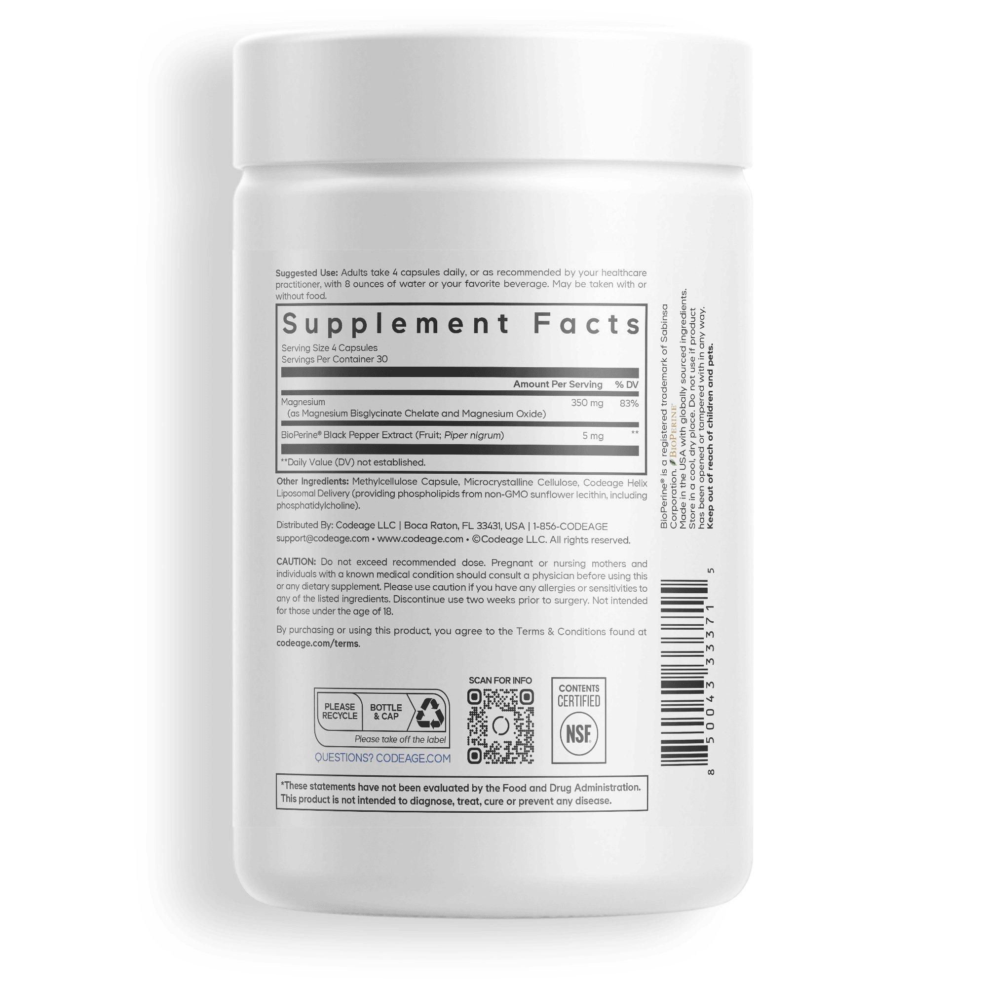 Codeage Liposomal Magnesium Glycinate Capsules provide 350 mg of magnesium bisglycinate chelate per serving, delivered with a liposomal system to promote absorption. This product ed to fit into a daily wellness routine. It is NSF certified and manufactured in a cGMP facility for quality assurance.