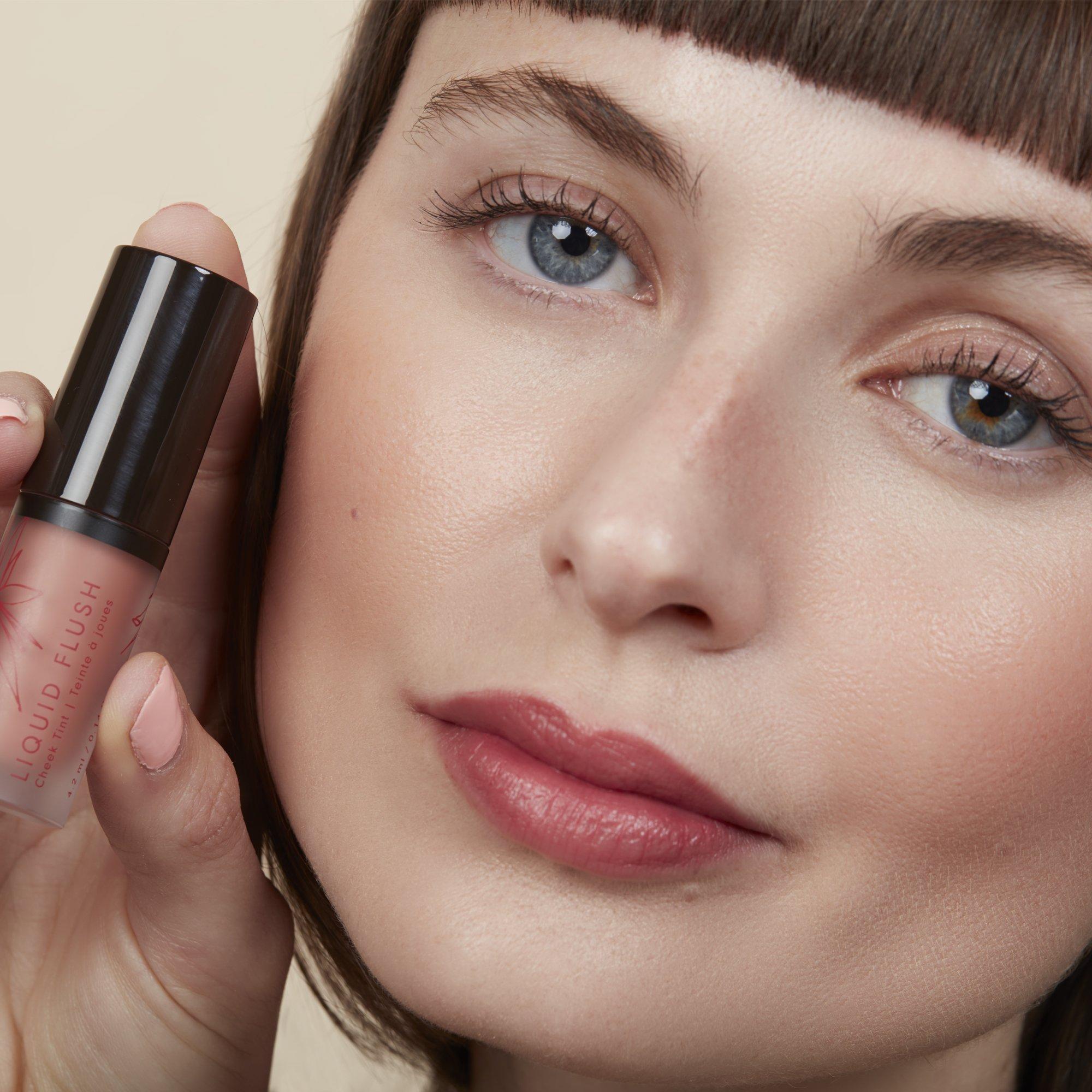 Apply a dot of Liquid Flush to the high points of your cheeks, blending with your fingers or our Hybrid Cream Brush, and build up the color as needed to intensify. For a sun-kissed look, add a bit to the nose.