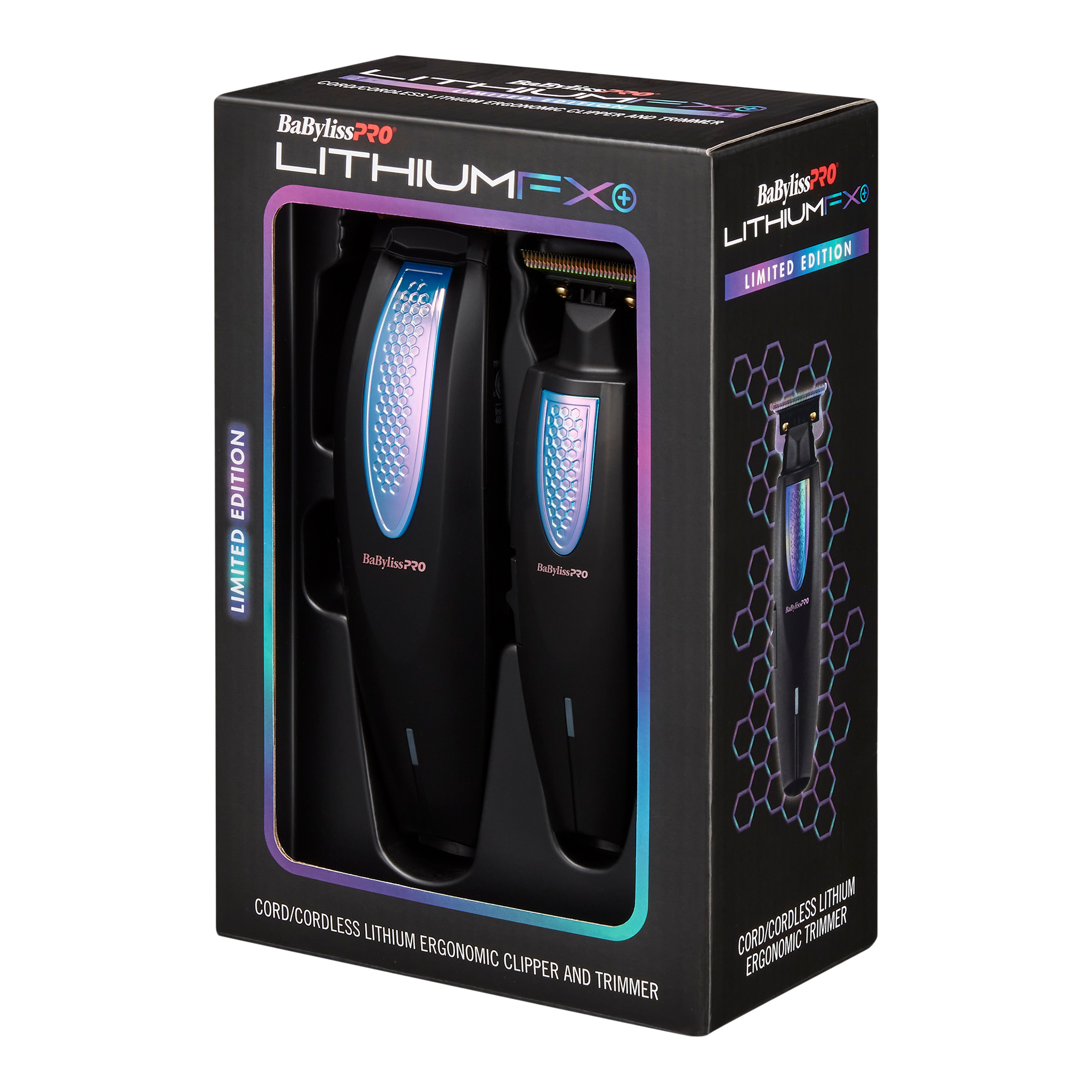 This duo pack features BaBylissPRO's LithiumFX Cord/Cordless Clipper & Trimmer. These tools are ergonomically designed and feature the flexibility to use either cordless or corded. Included with the pre-pack are (6) guards for the clipper.