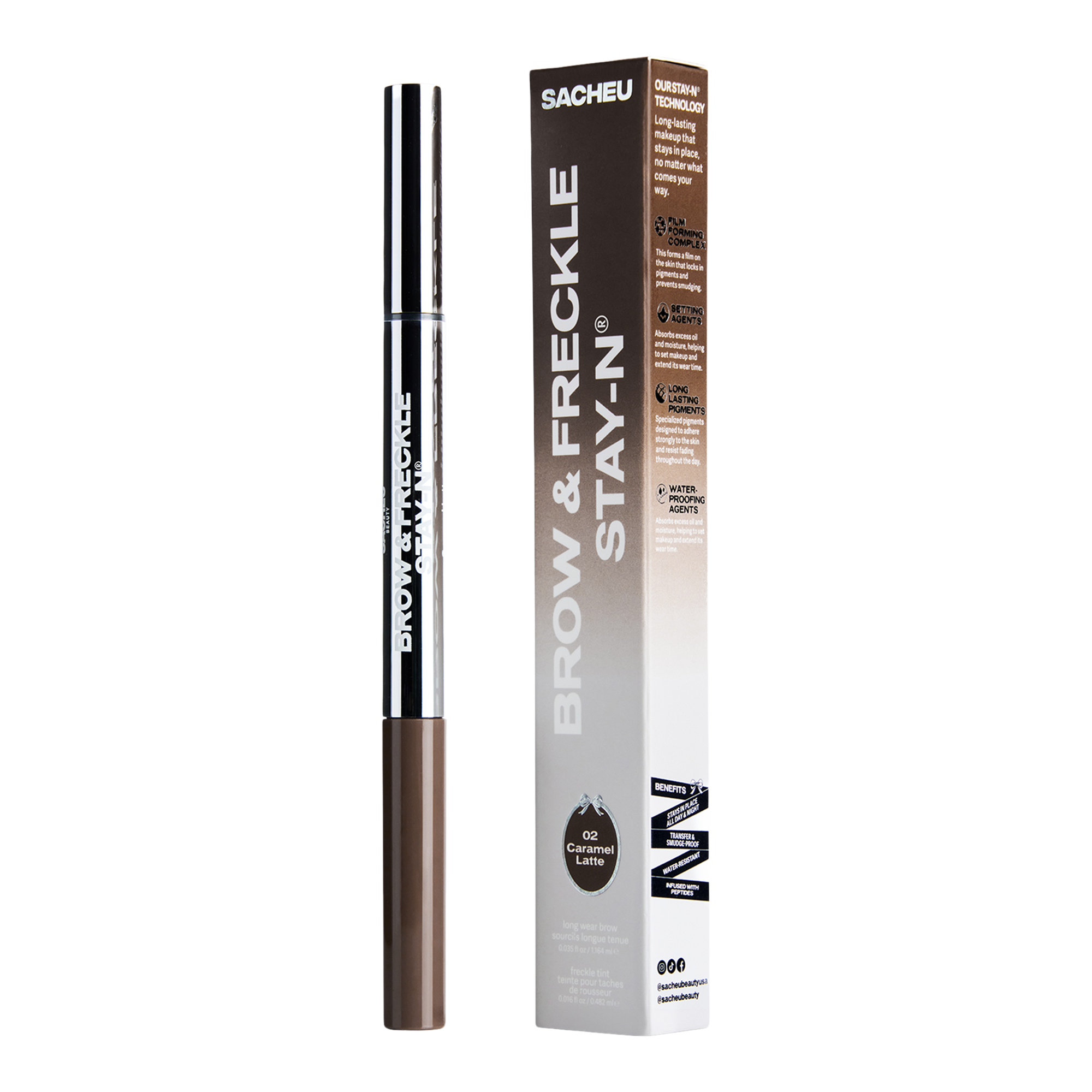 Presenting the Sacheu Beauty's 2-in-1 Long Wear Brow & Freckle Tint STAY-N for effortlessly fluffy brows and natural-looking freckles. The benefit-infused formula conditions while delivering smudge-proof, fade-resistant color that lasts all day.