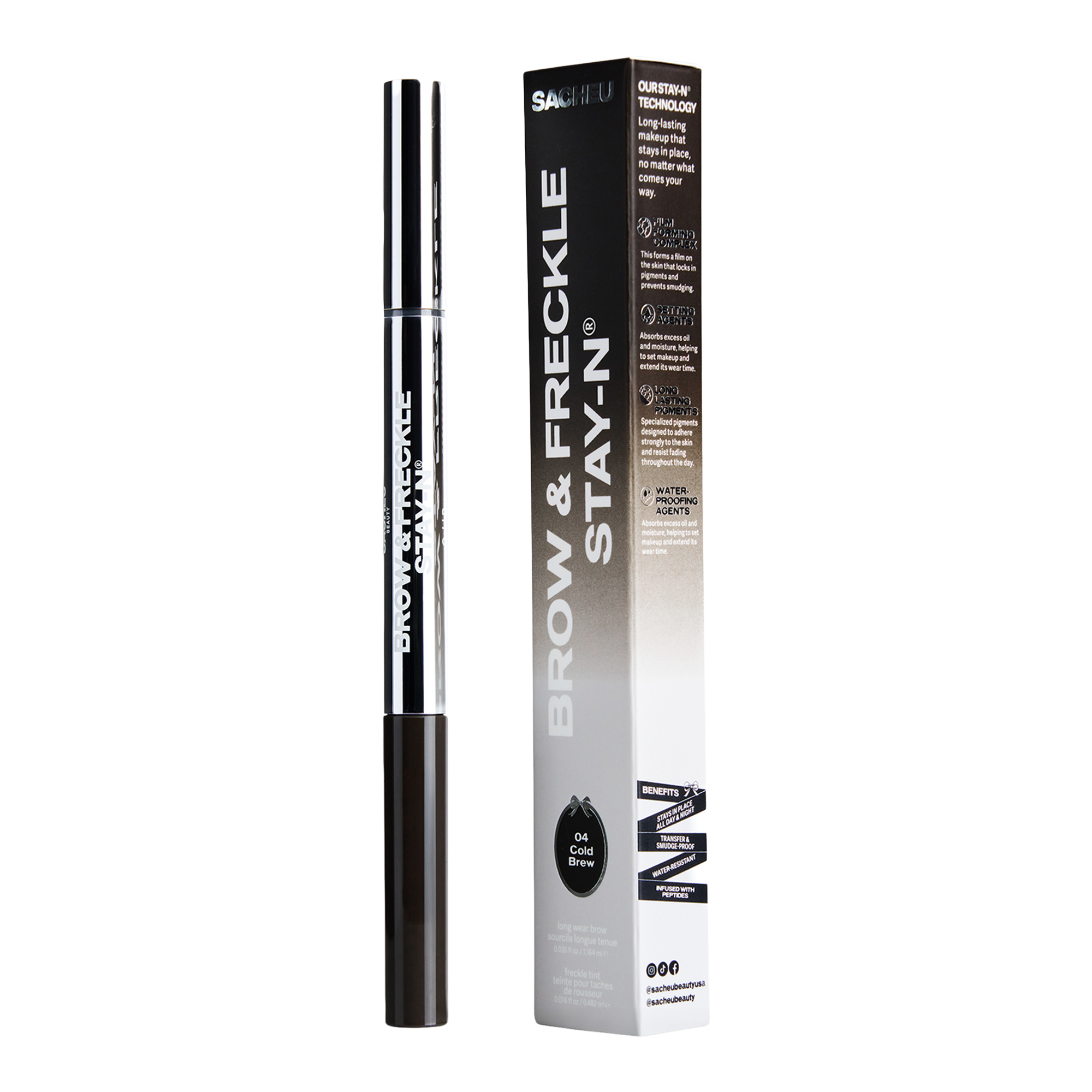 Presenting the Sacheu Beauty's 2-in-1 Long Wear Brow & Freckle Tint STAY-N for effortlessly fluffy brows and natural-looking freckles. The benefit-infused formula conditions while delivering smudge-proof, fade-resistant color that lasts all day.