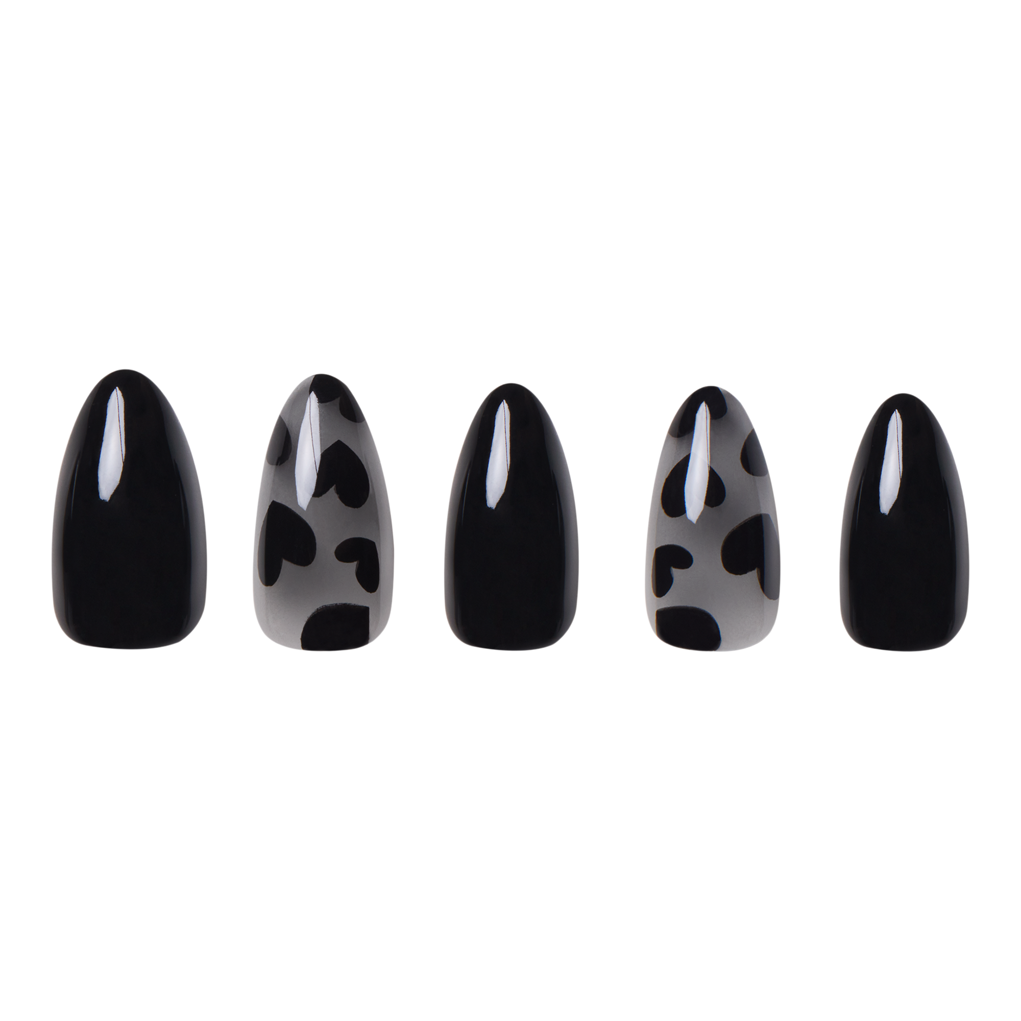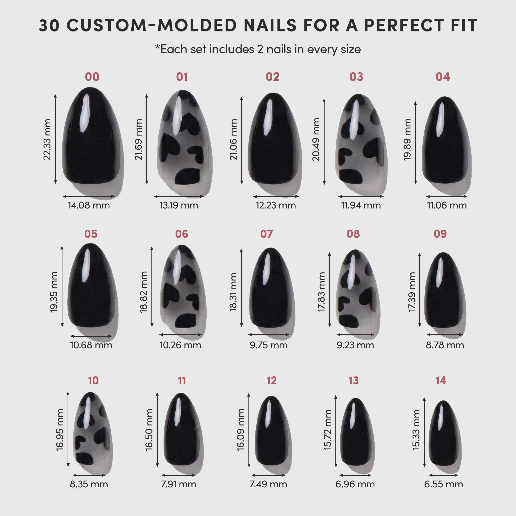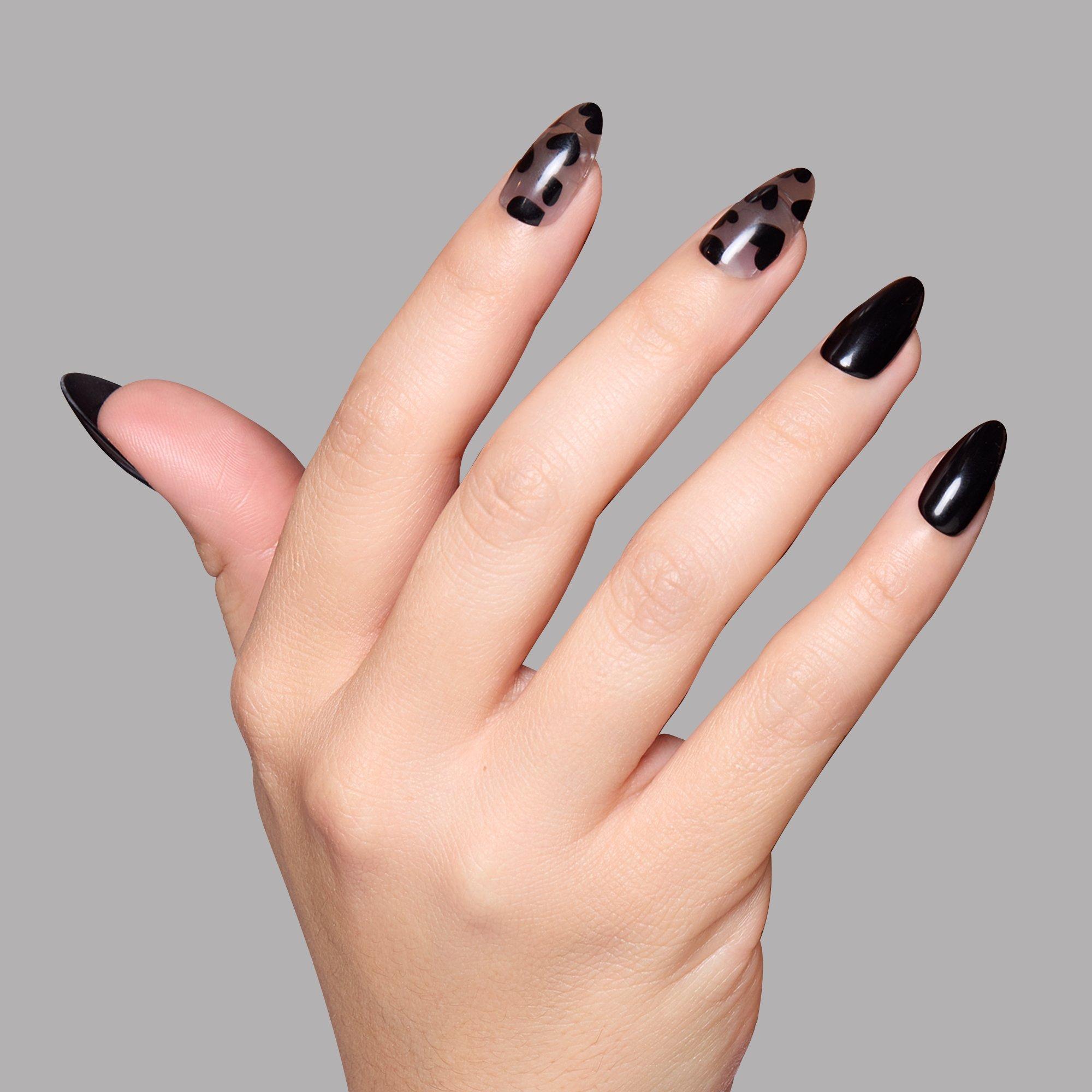 Make a bold statement with Love Me Not. These short almond nails combine opaque black and semi-transparent bases with heart accents, delivering a unique blend of edgy romance. Perfect for date nights or when you want to show some attitude, this style adds a modern twist to classic black nails.