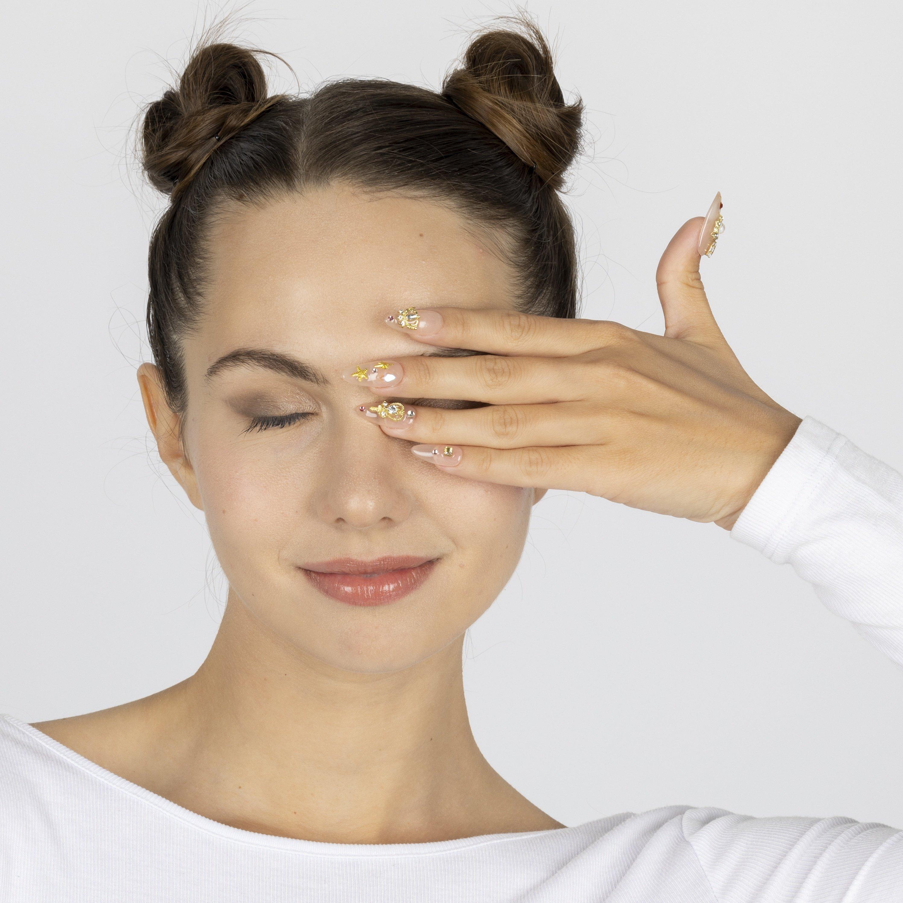 Natural toned almond nails with gold-framed hearts, stars, moons, and gem details. A regal design made from high-quality materials. Reusable and easy to apply for a soft, luxurious finish.