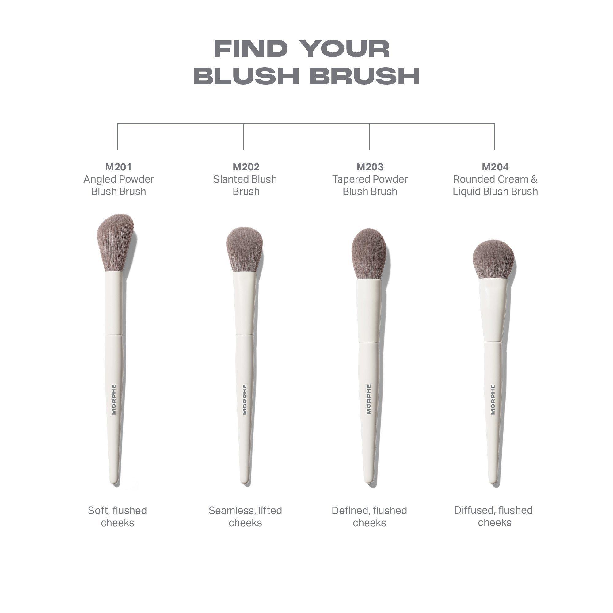 The larger, fluffy head of Morphe's M203 Tapered Powder Blush Brush helps enhance product payoff. Use it at an angle to press on and build your color as desired. Then blend the color out with the tapered tip, which adapts to your cheek curves for an effortlessly diffused effect.