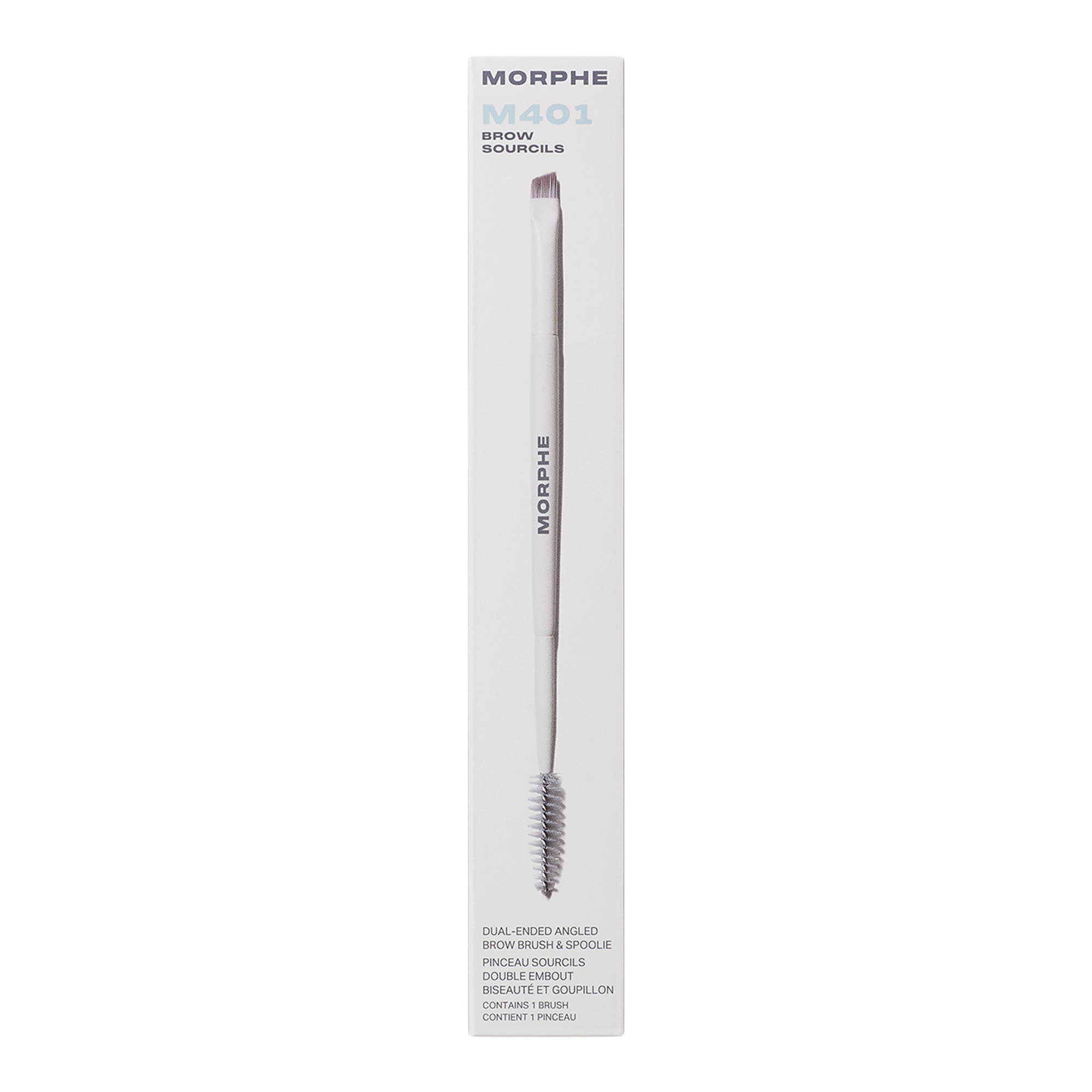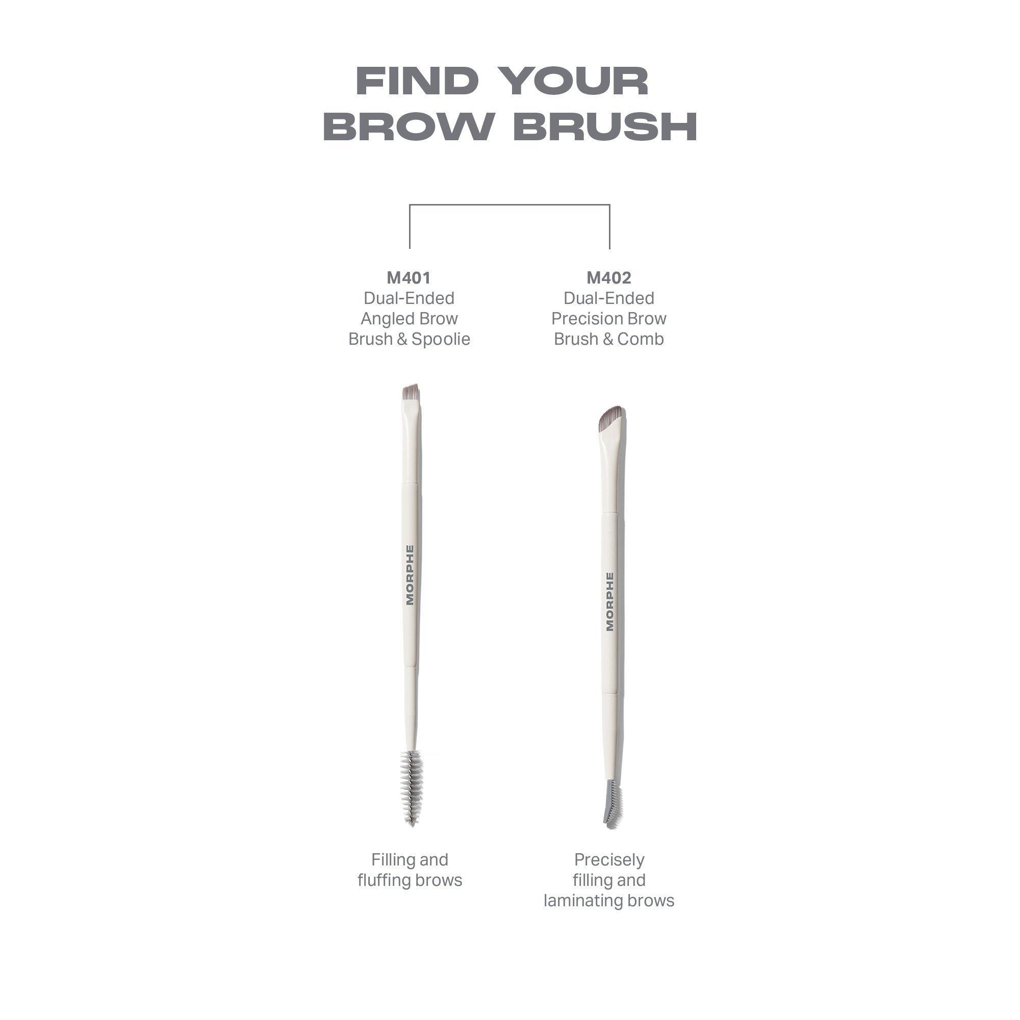 Fill and fluff brows with Morphe's M401 Dual-Ended Angled Brow Brush & Spoolie. Use the precision angled brush to create hairlike strokes in sparse areas and for defining your brow shape. Then use the spoolie to blend and comb product through for soft, natural-looking effects.