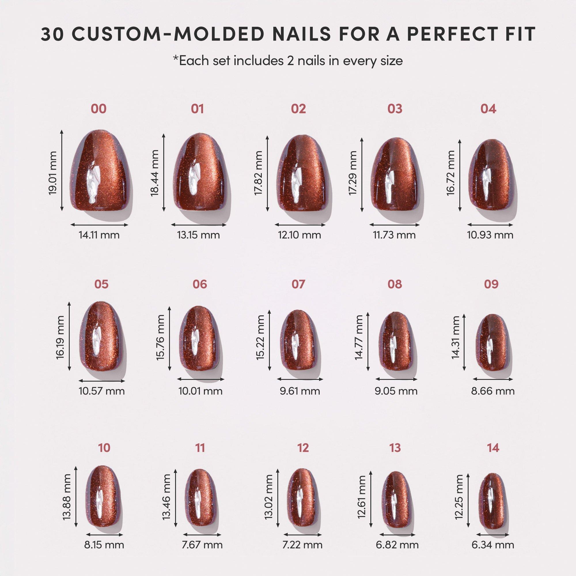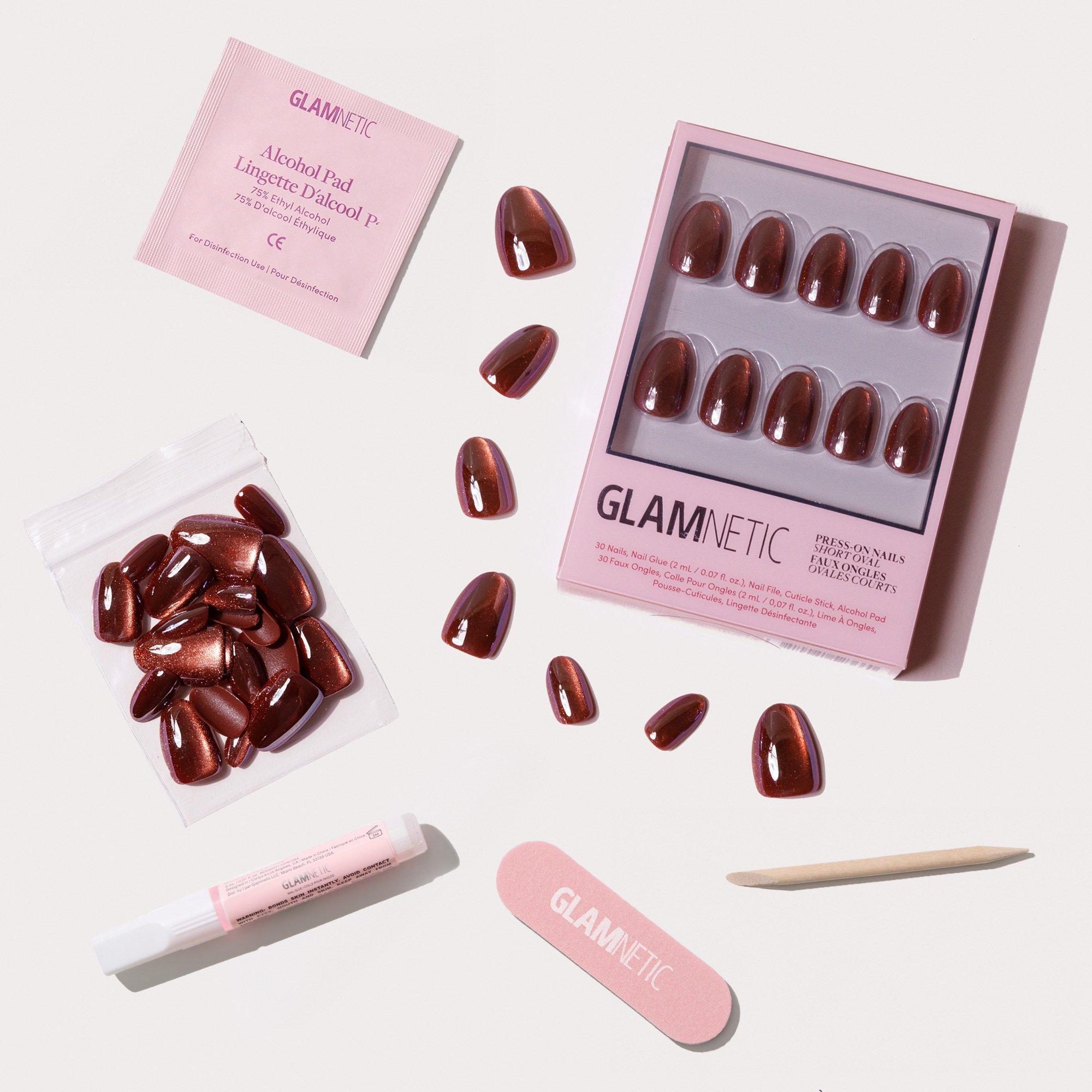 Warning: may cause double takes. Glamnetic Magnetic Moscow Press-On Nails channel hypnotic cat-eye shimmer in a copper-toned shade that shifts & gleams with every movement. Designed in a Short Oval shape for effortless wear, this magnetic finish brings spooky season glam without a spell in sight.