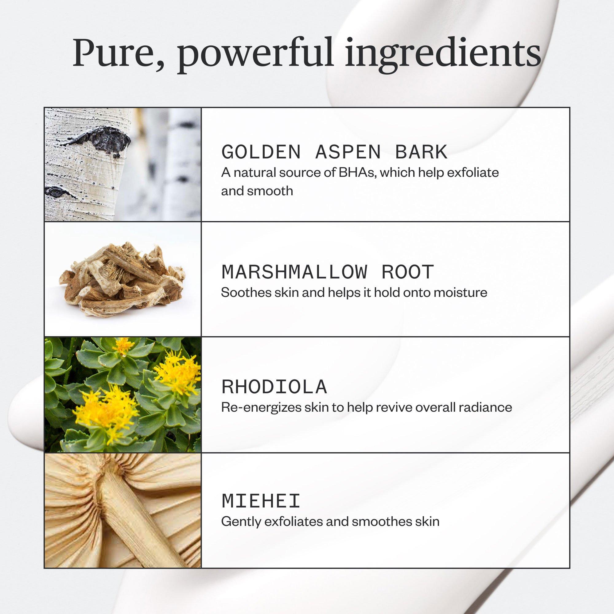 • Golden Aspen Bark: a natural source of beta hydroxy acids (BHAs) that help exfoliate and smooth skin