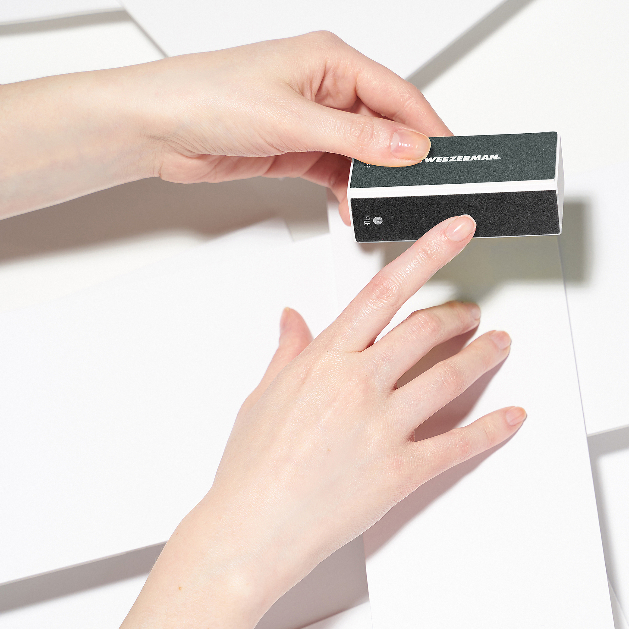 3. Buff away imperfections with the nail buffer. Use the black pad to file, the dark grey pad to buff, the light grey pad to smooth and finally, the white pad to shine nail beds.