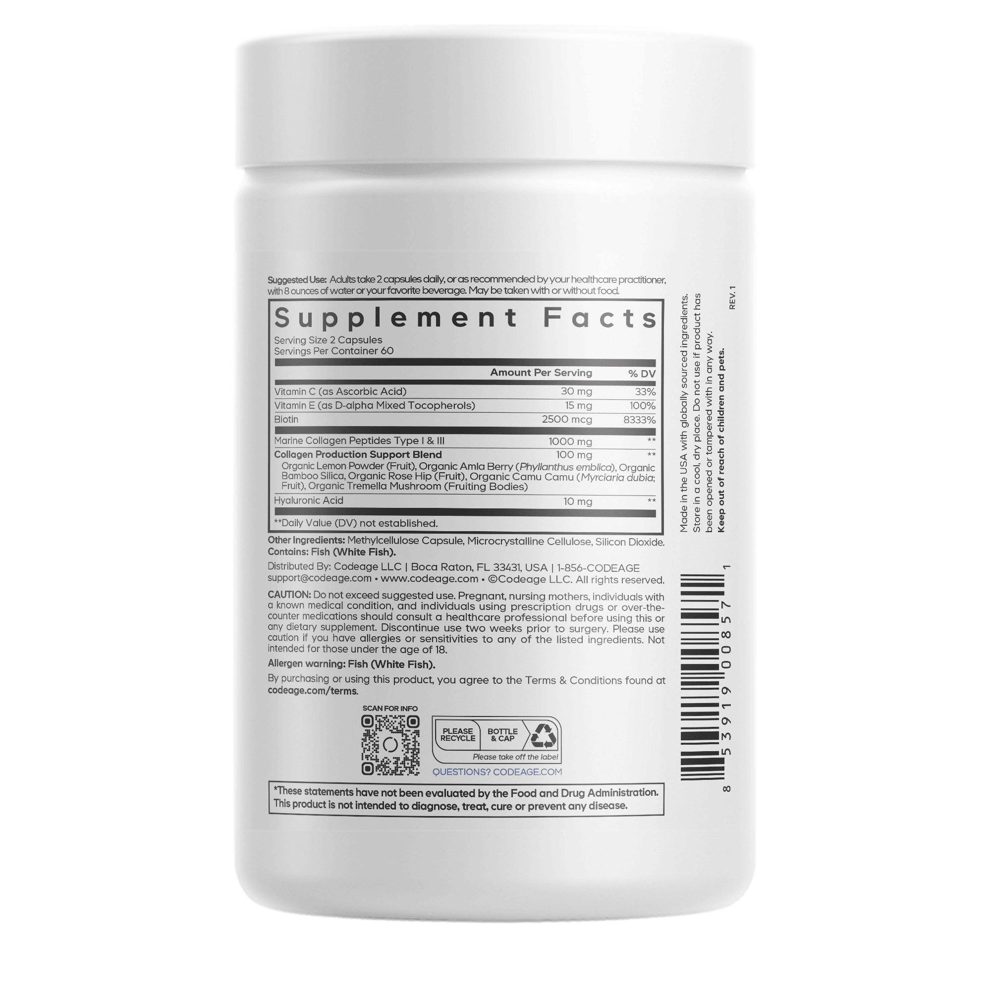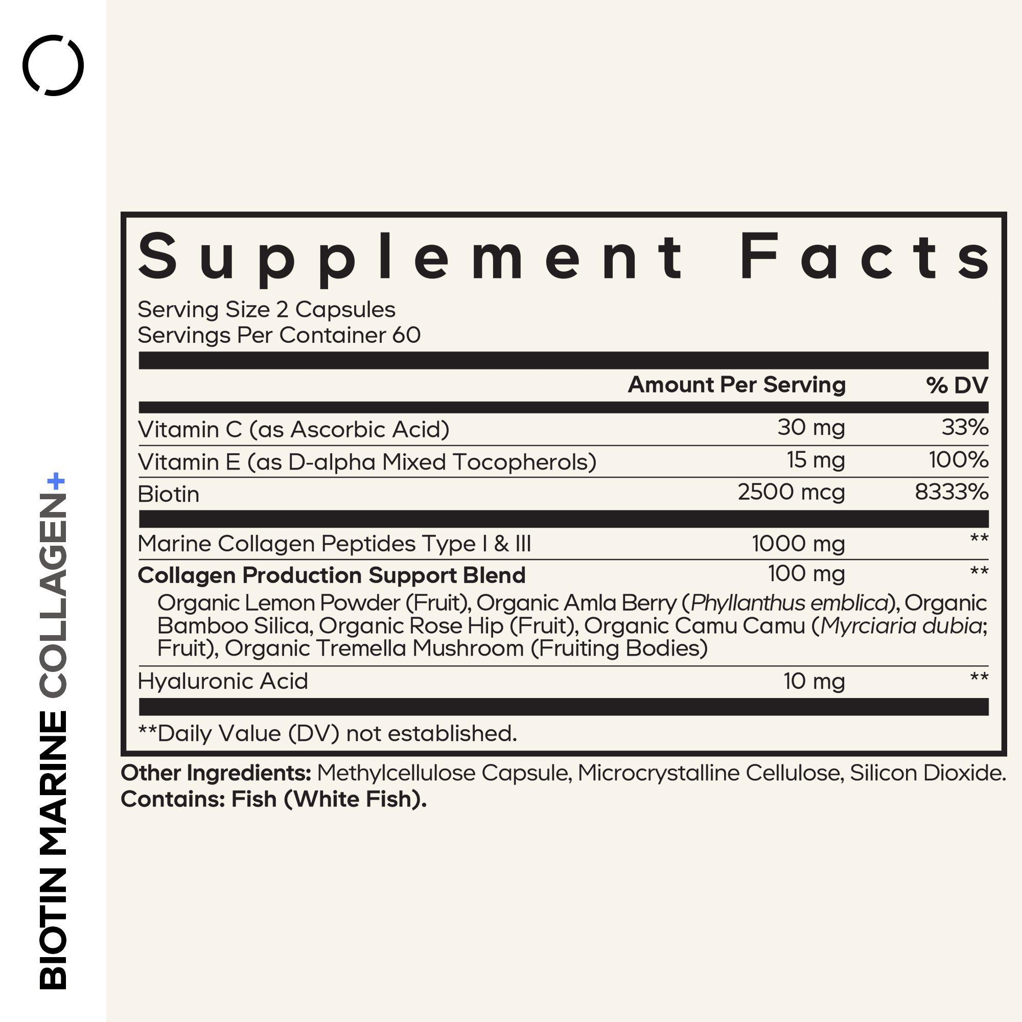 Vitamin C (as Ascorbic Acid), Vitamin E (as D-alpha Mixed Tocopherols), Biotin, Marine Collagen Peptides Type I & III, Collagen Production Support Blend: Organic Lemon Powder (Peel), Organic Amla Berry (Phyllanthus emblica), Organic Bamboo Silica, Organic Rose Hip (Fruit), Organic Camu Camu (Myrciaria dubia; Fruit), Organic Tremella Mushroom (Fruiting Bodies); Hyaluronic Acid. Other Ingredients: Methylcellulose Capsule, Silicon Dioxide. Contains: Fish (White Fish).
