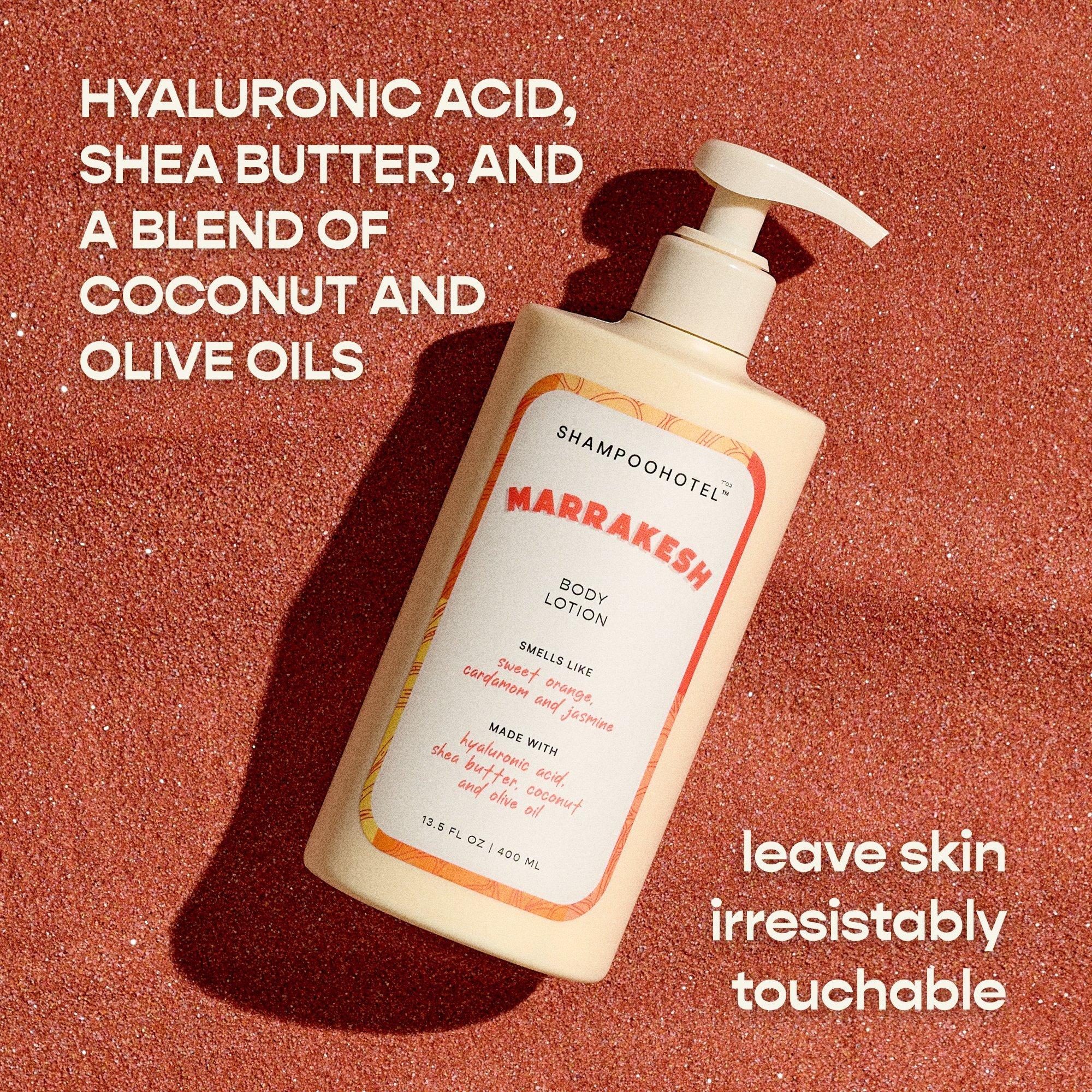 SHAMPOOHOTEL Marrakesh Body Lotion melts into skin, leaving it silky-soft and deeply hydrated. Infused with hyaluronic acid, shea butter, coconut, and olive oil. Nourish and wrap your skin in the essence of Marrakesh, with the warm scent of sweet orange, cardamom, and jasmine.
