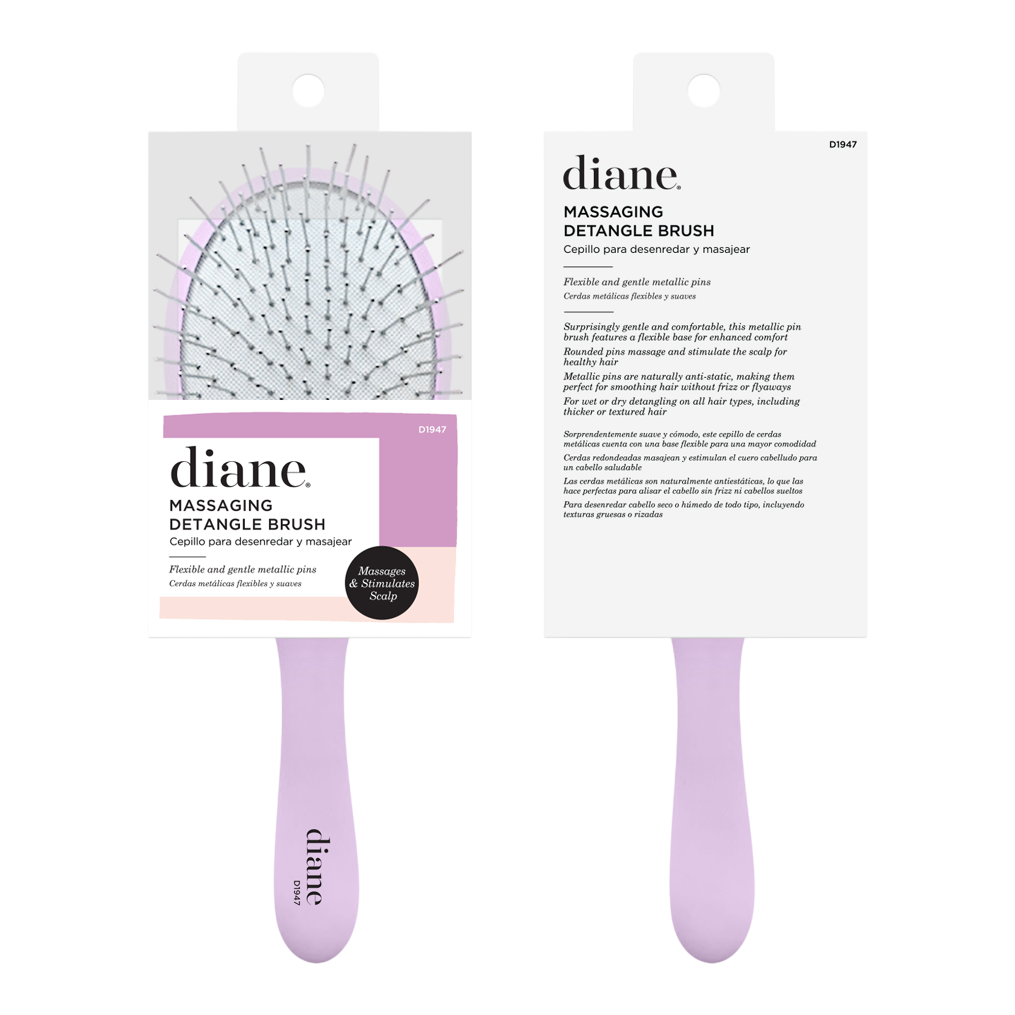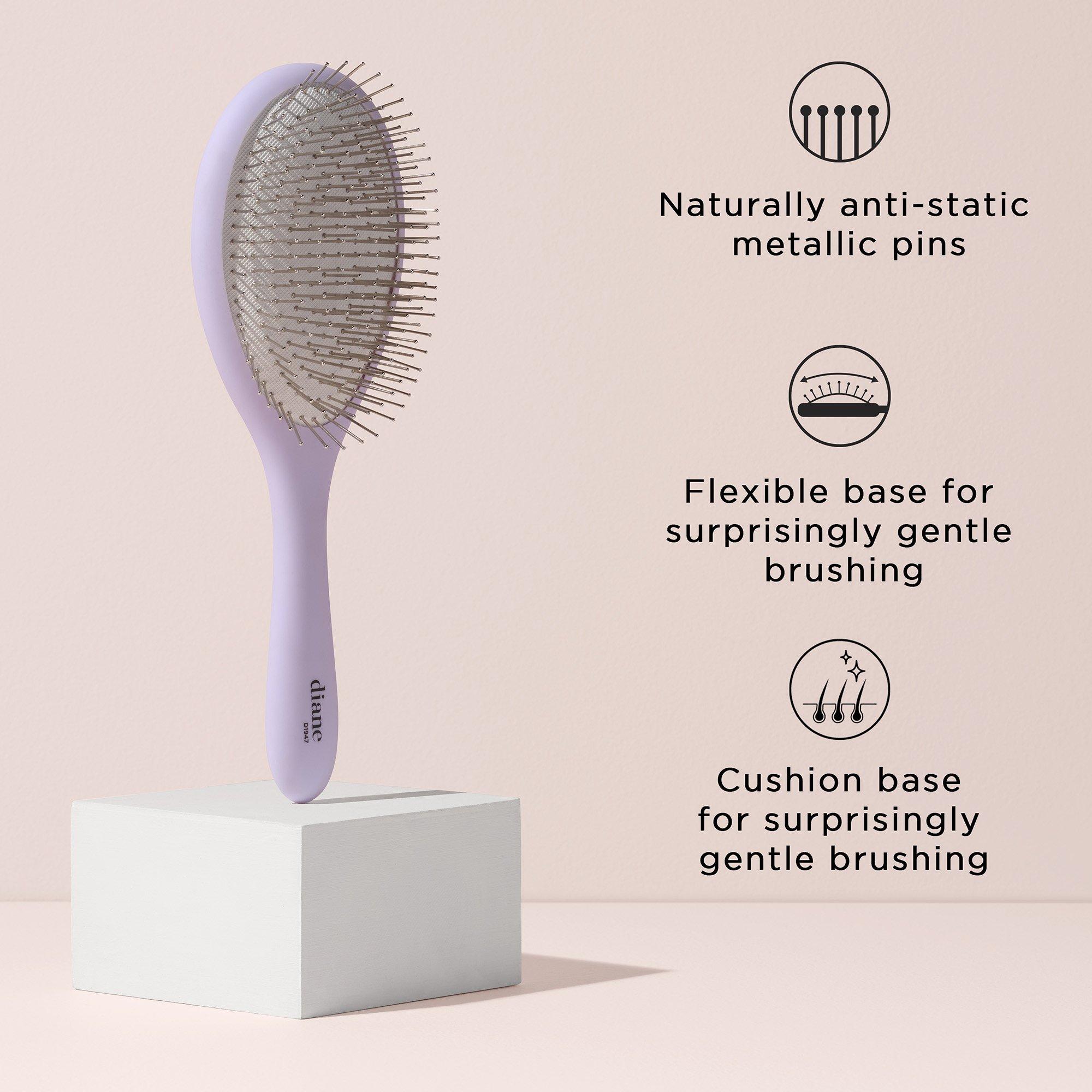 The Diane Massaging Detangle Brush features anti-static metallic pins that gently massage the scalp and stimulate circulation while brushing.