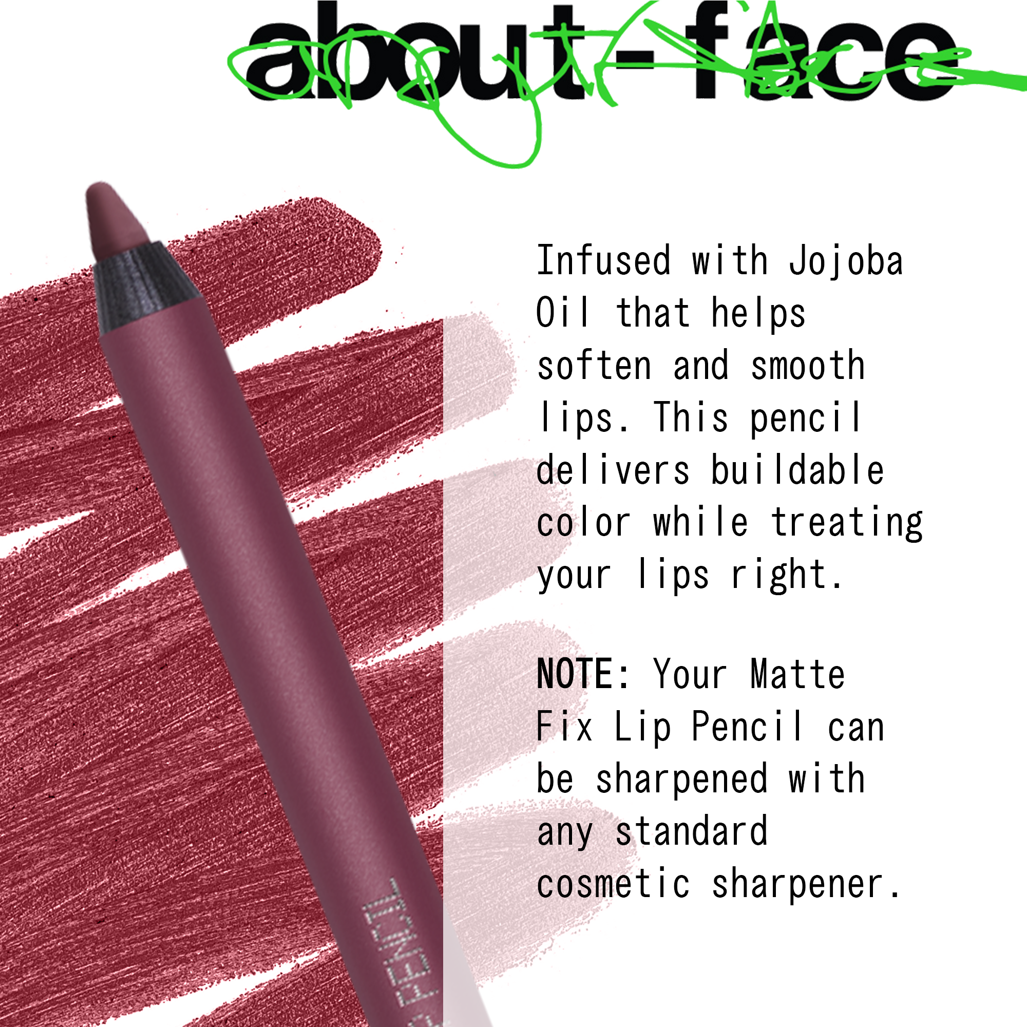 The about-face Matte Fix Lip Pencil is a glide-on matte, creamy liner that defines lips for 7+ hours while delivering bold, buildable color.